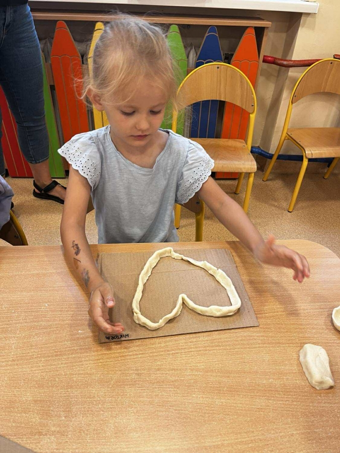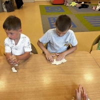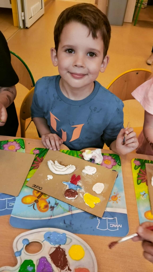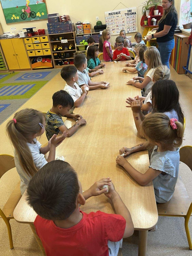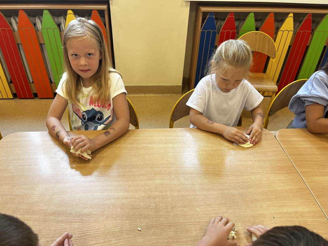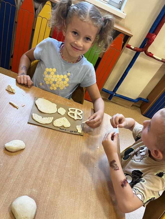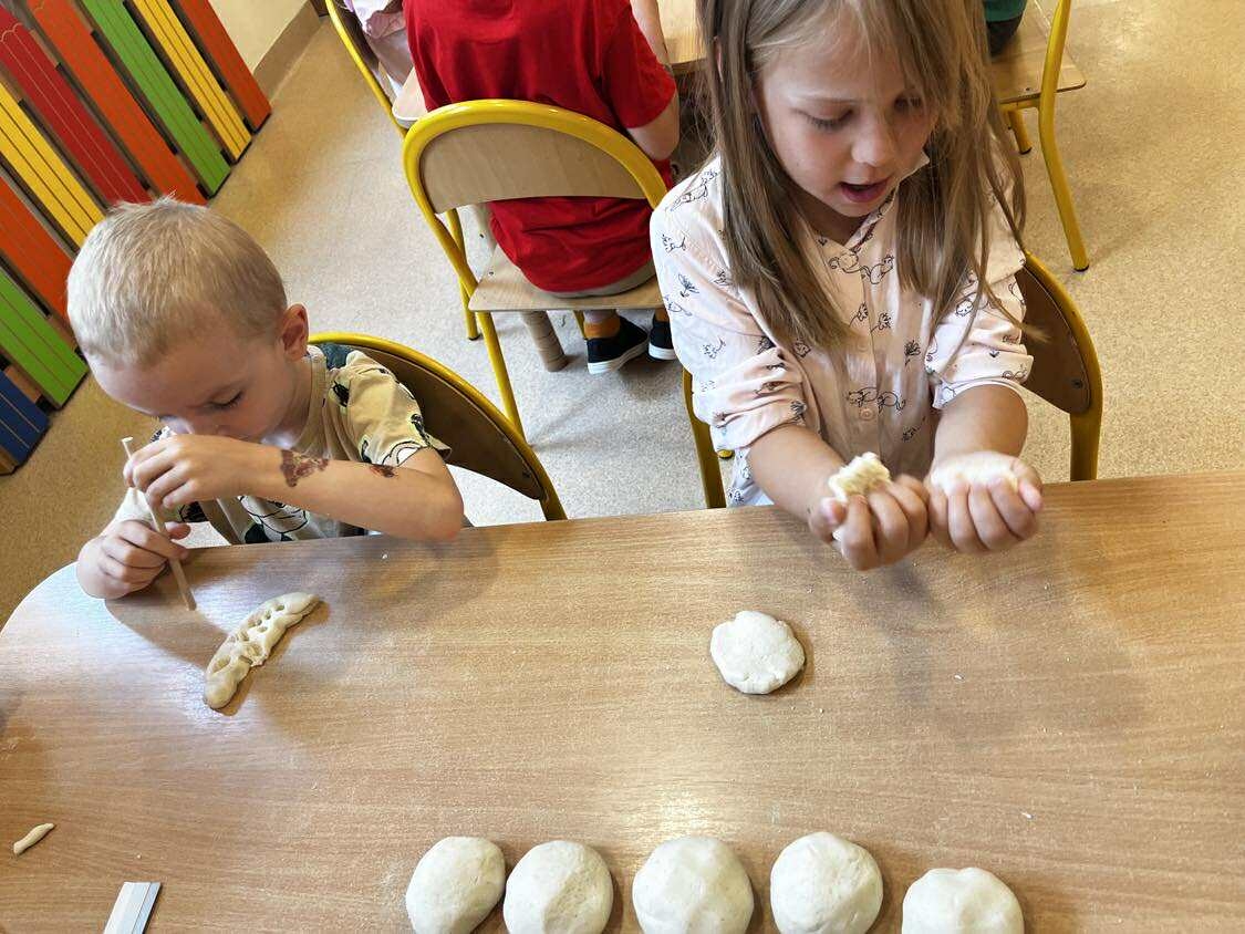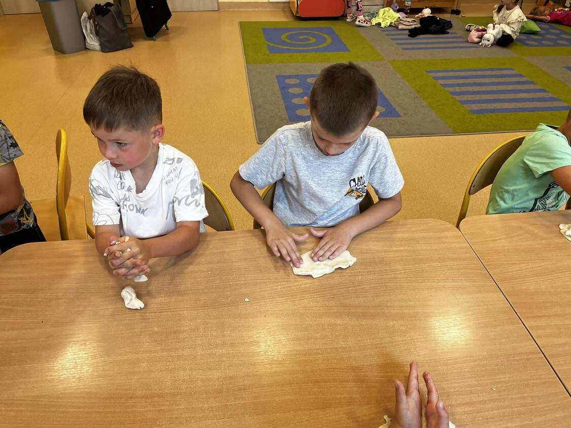 Podczas wakacyjnego dyżuru w przedszkolu dzieci uczestniczyły w kreatywnych zajęciach z masą solną. Lepiły z niej różnorodne figurki – od zwierzątek po wakacyjne ozdoby. Zabawa rozwijała sprawność manualną, wyobraźnię oraz przyniosła wiele radości. Gotowe prace zostały pomalowane i zabrane do domu jako pamiątka.