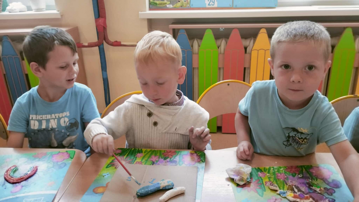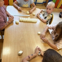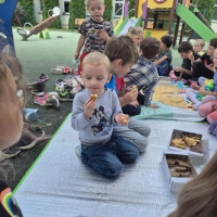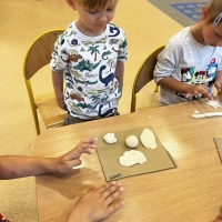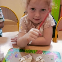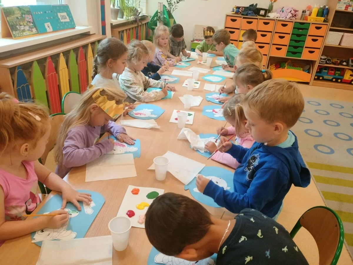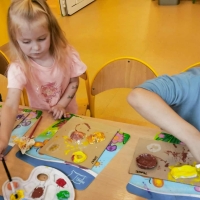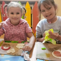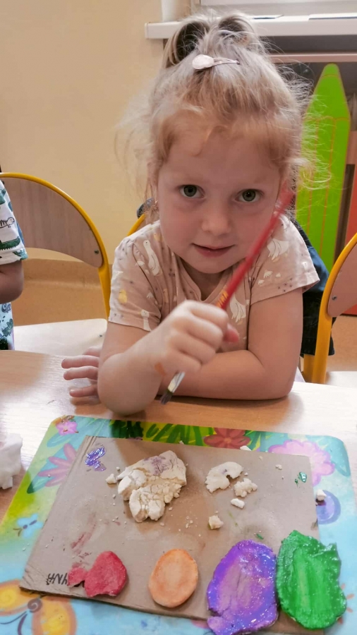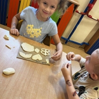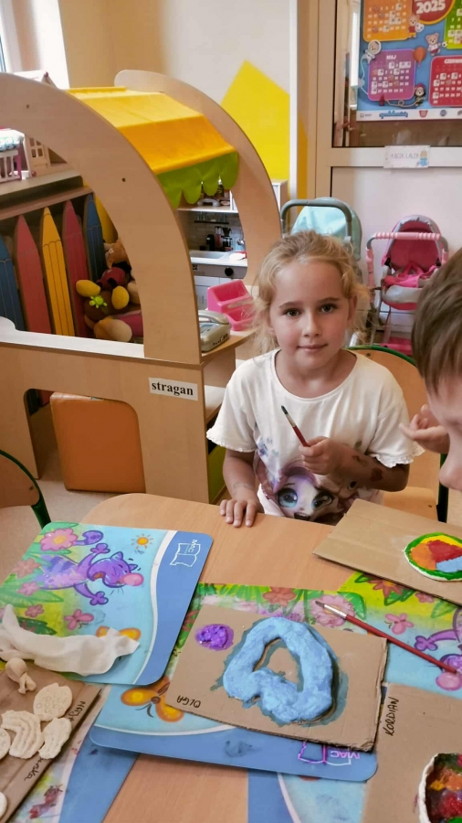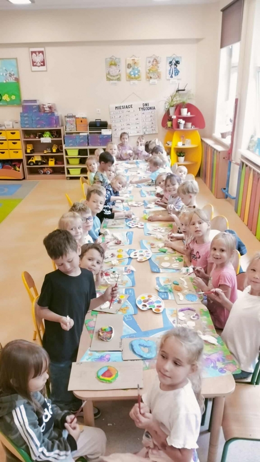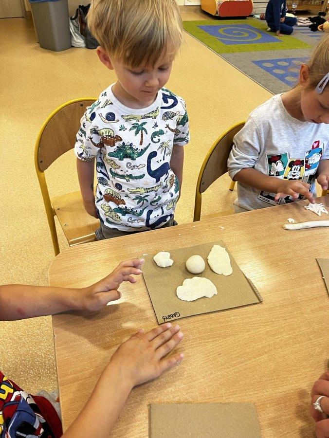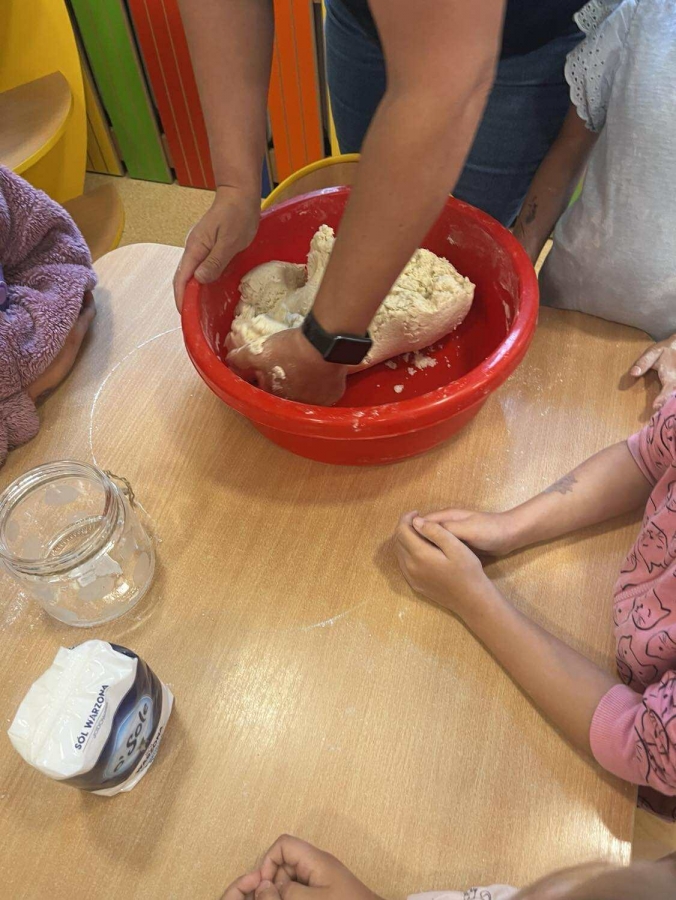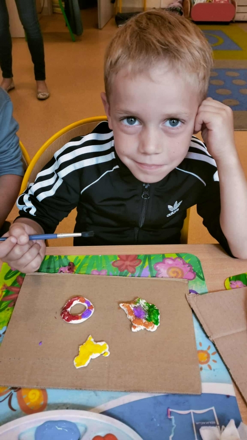 Podczas wakacyjnego dyżuru w przedszkolu dzieci uczestniczyły w kreatywnych zajęciach z masą solną. Lepiły z niej różnorodne figurki – od zwierzątek po wakacyjne ozdoby. Zabawa rozwijała sprawność manualną, wyobraźnię oraz przyniosła wiele radości. Gotowe prace zostały pomalowane i zabrane do domu jako pamiątka.