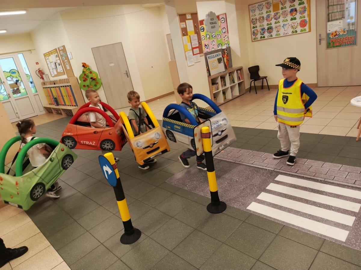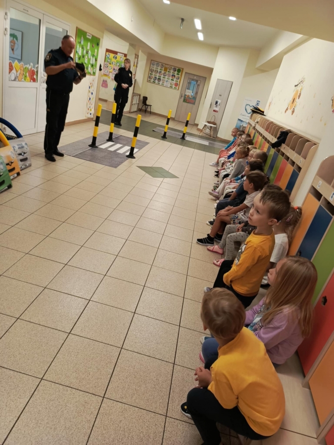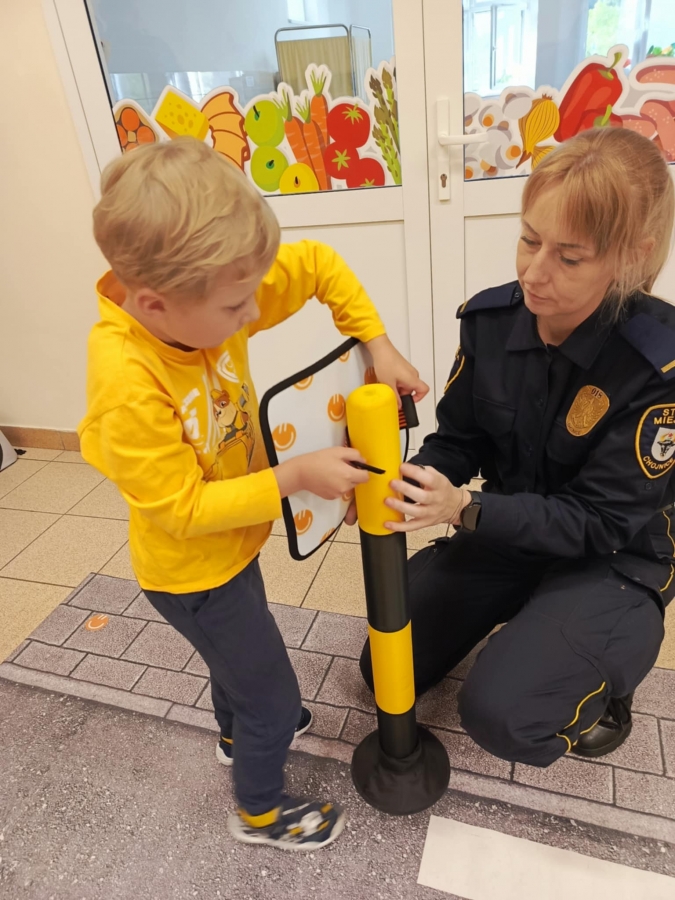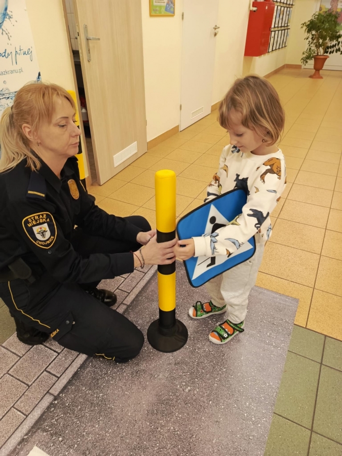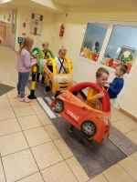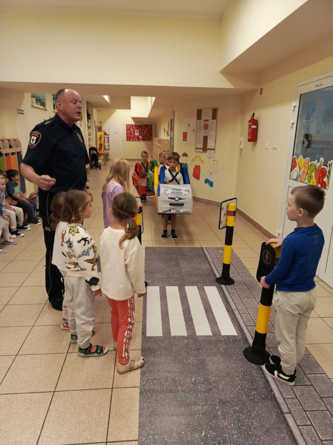 Nasze przedszkole odwiedzili pracownicy straży miejskiej. Przeprowadzili krótką pogadankę na temat bezpiecznego poruszania się po drodze. Pokazali elementy umundurowania i wyposażenia strażnika. Dzieci wzięły również udział w ćwiczeniach praktycznych ucząc się przechodzenia przez przejście dla pieszych oraz kierując autami.