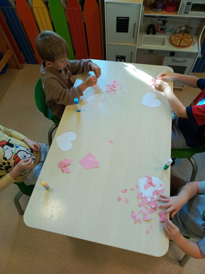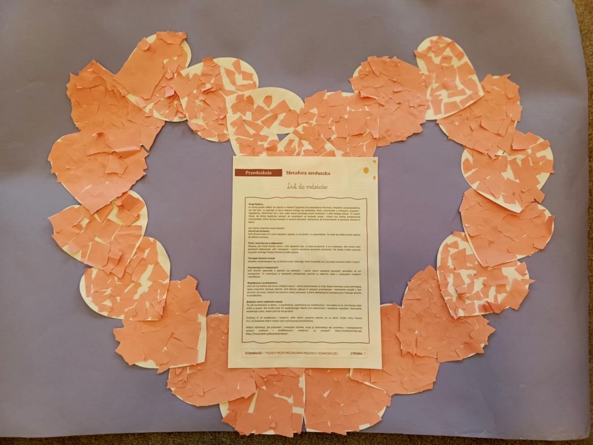 W ramach ogólnopolskiej inicjatywy "Tygodnia budowania relacji" dzieci wzięły udział w zajęciach mających na celu wspomaganie rozwoju wspierających kompetencji spolecznych, pomaganie dzieciom reagować adekwatnie w trudnych sytuacjach, budowanie życzliwego klimatu w grupie. Lekcja opierała się na Tablicy emocji, opowiadaniu "Serduszko z listków" i wspólnie wykonanej pracy plastycznej.