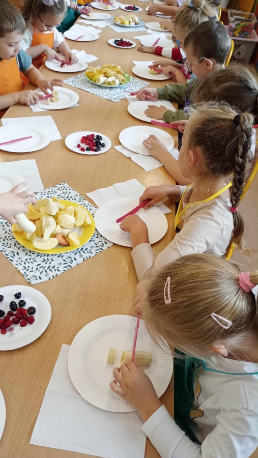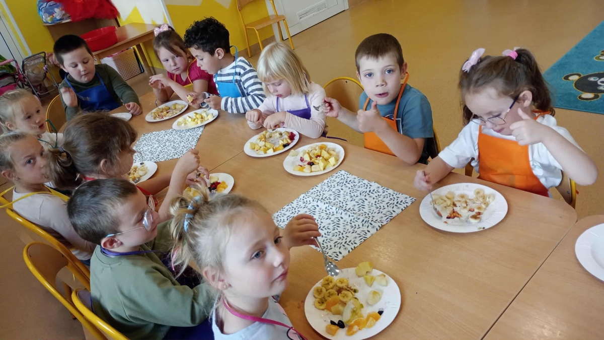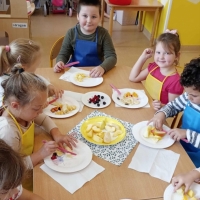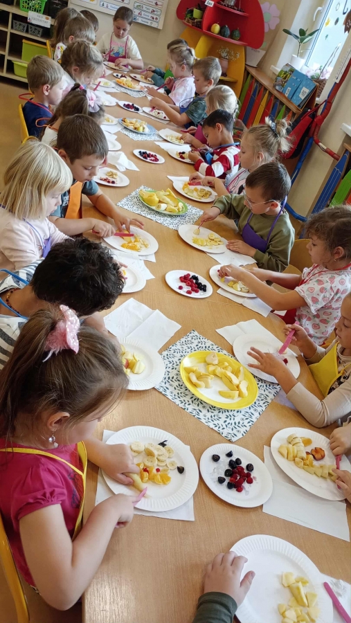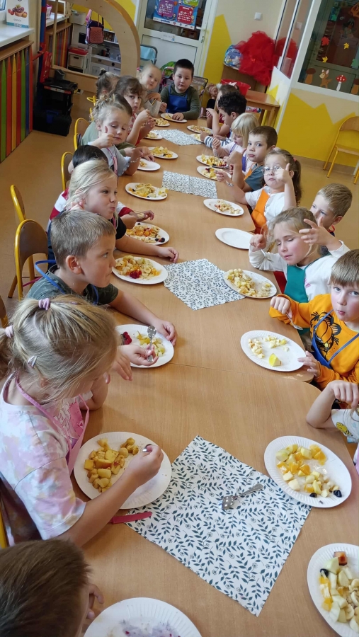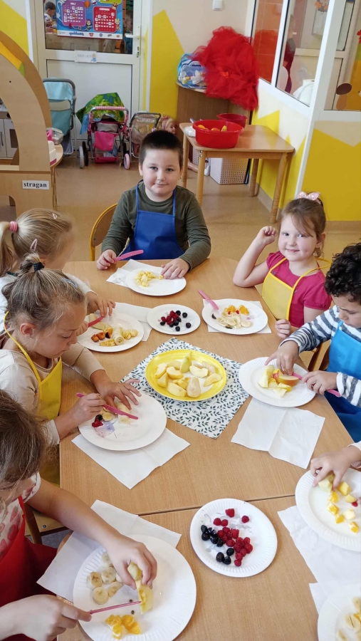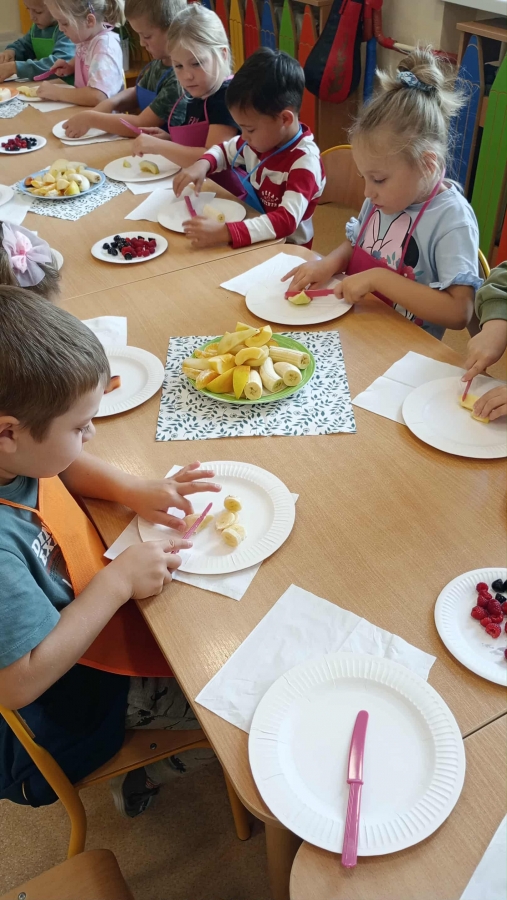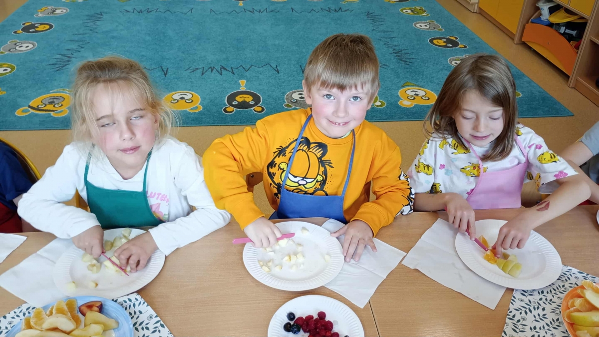 W piątkowe przedpołudnie przedszkolaki z grupy „Jeżyki” wcieliły się w rolę super master kucharzy od deserów i przygotowały pyszną sałatkę owocową. Do miski trafiły: jabłka, gruszki, winogrona, pomarańcze, banany, kiwi, mandarynki, truskawki i śliwki.