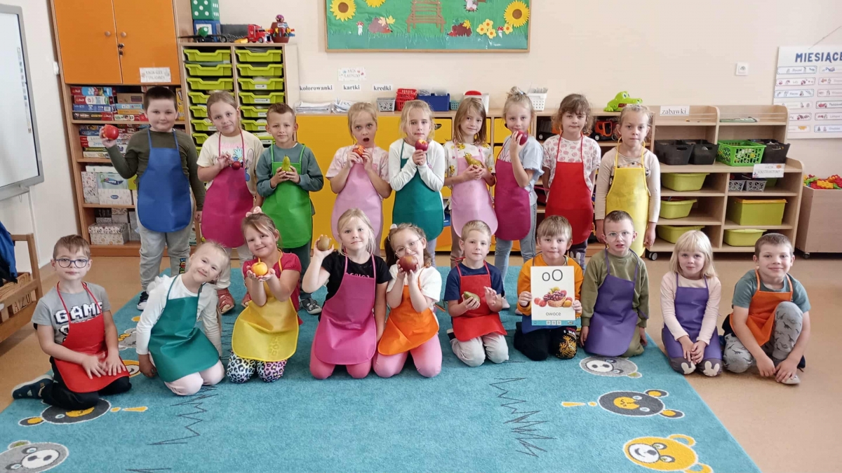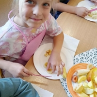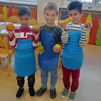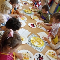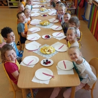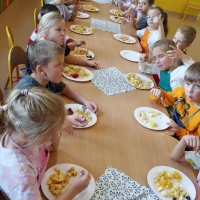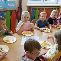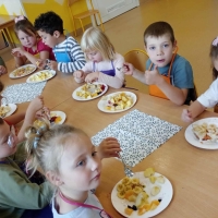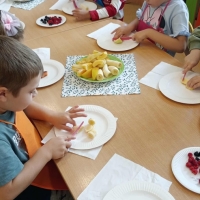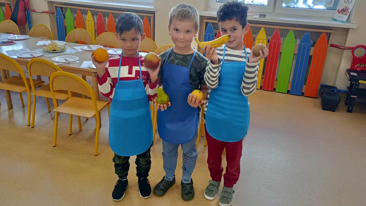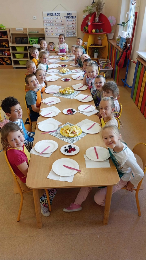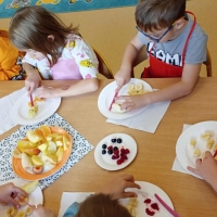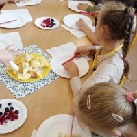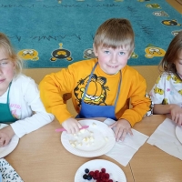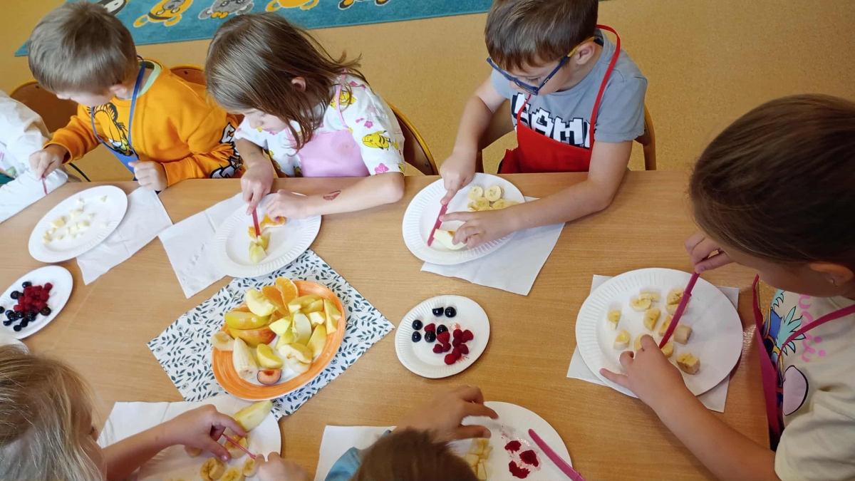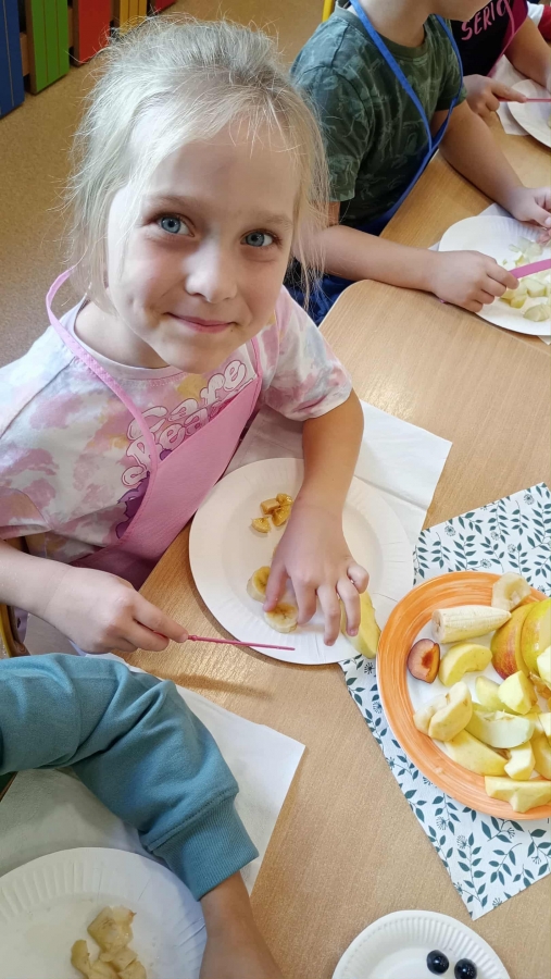 W piątkowe przedpołudnie przedszkolaki z grupy „Jeżyki” wcieliły się w rolę super master kucharzy od deserów i przygotowały pyszną sałatkę owocową. Do miski trafiły: jabłka, gruszki, winogrona, pomarańcze, banany, kiwi, mandarynki, truskawki i śliwki.