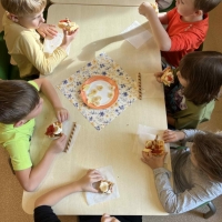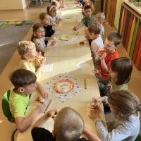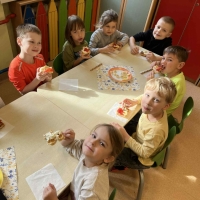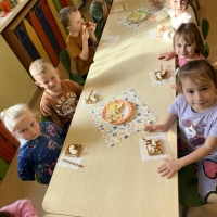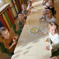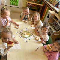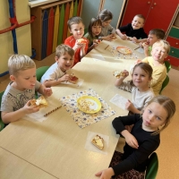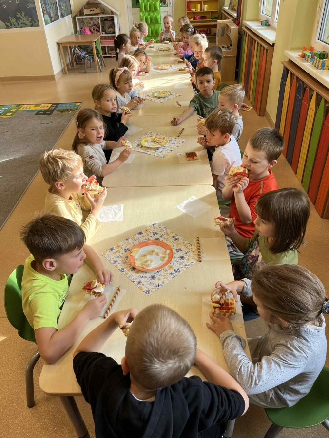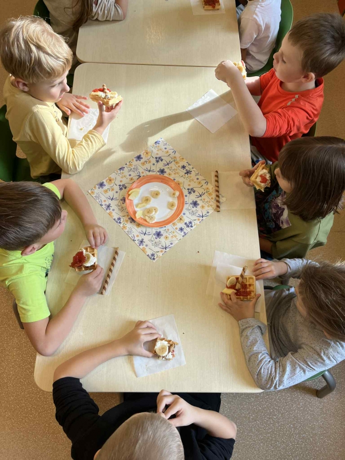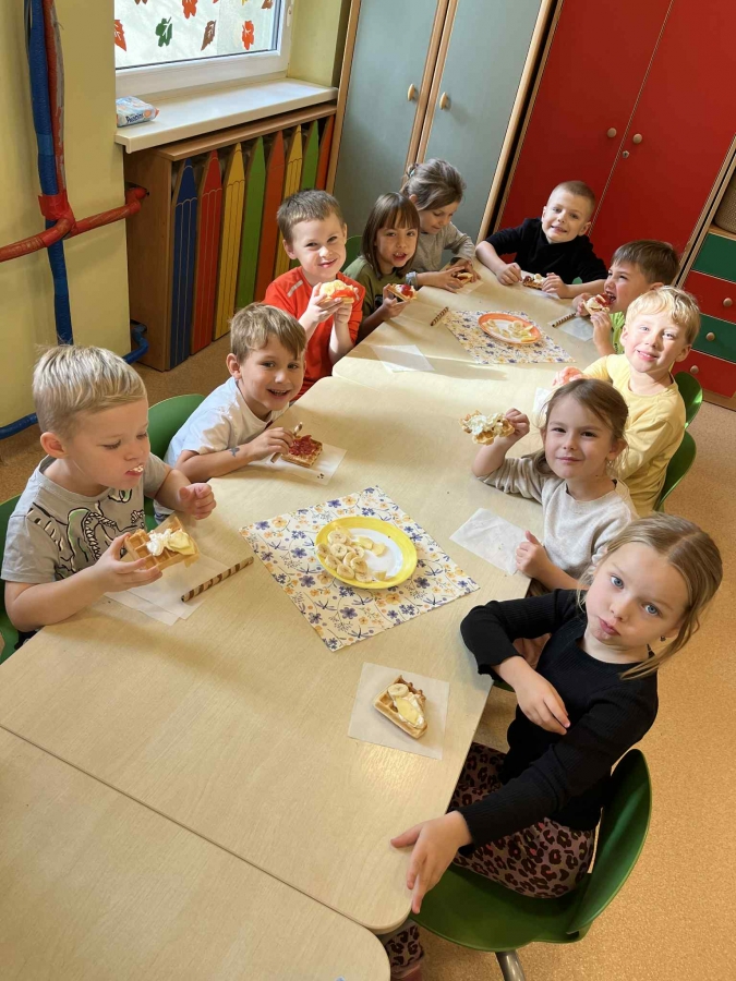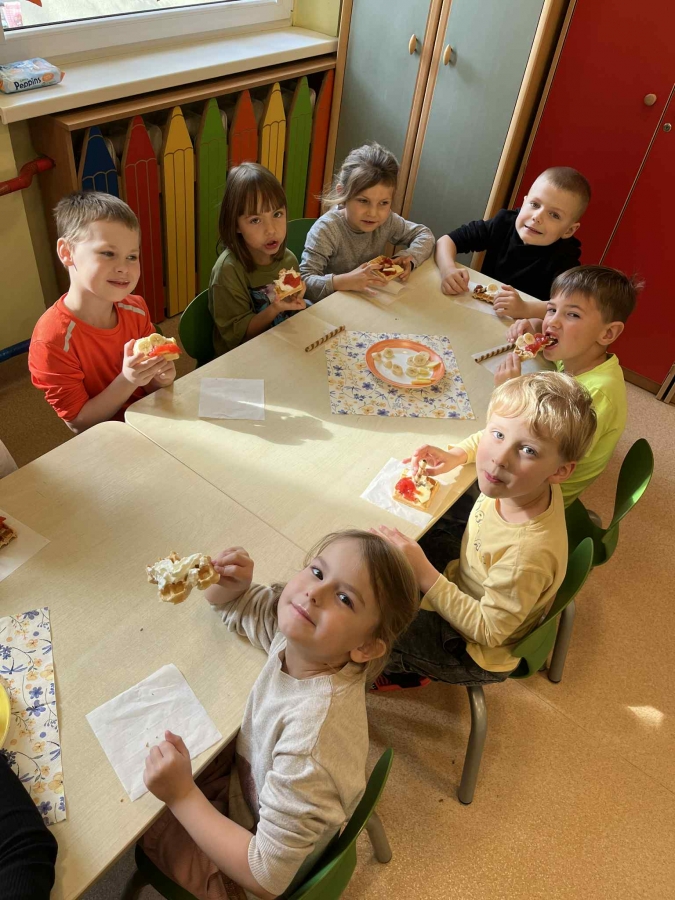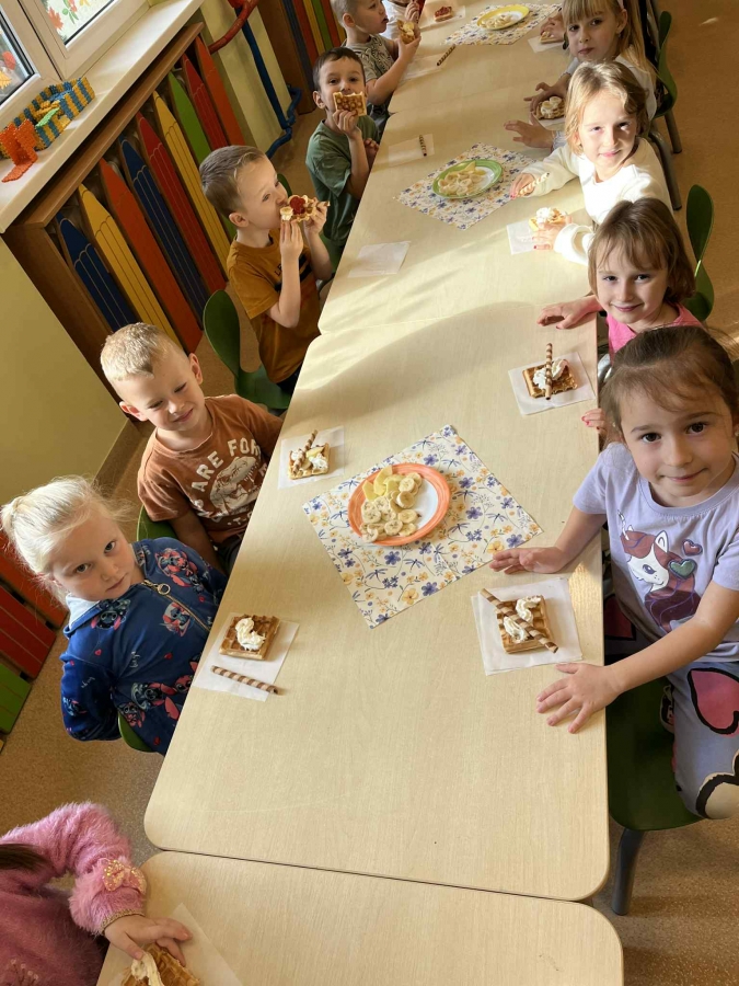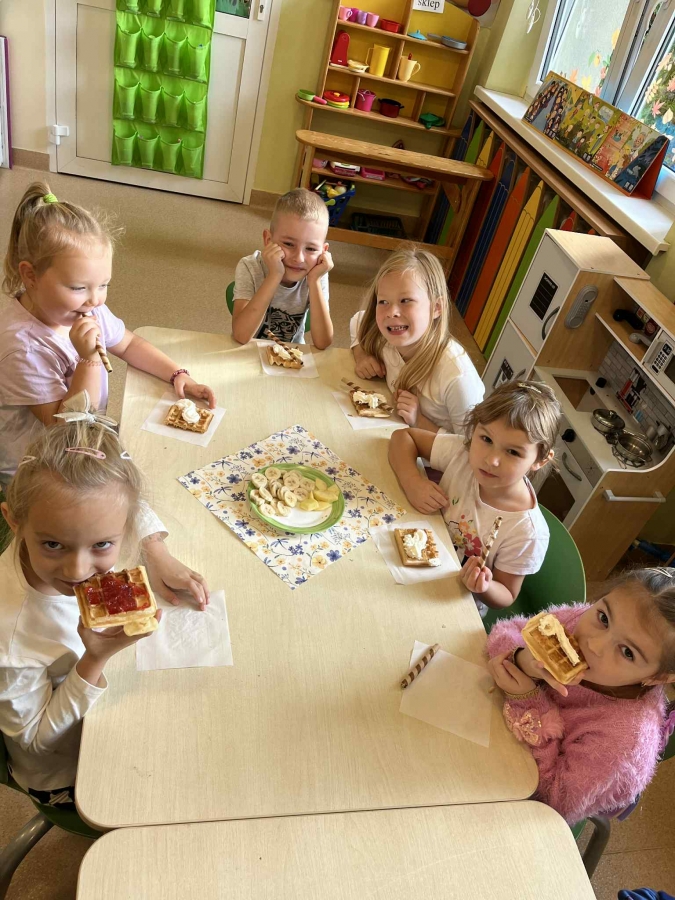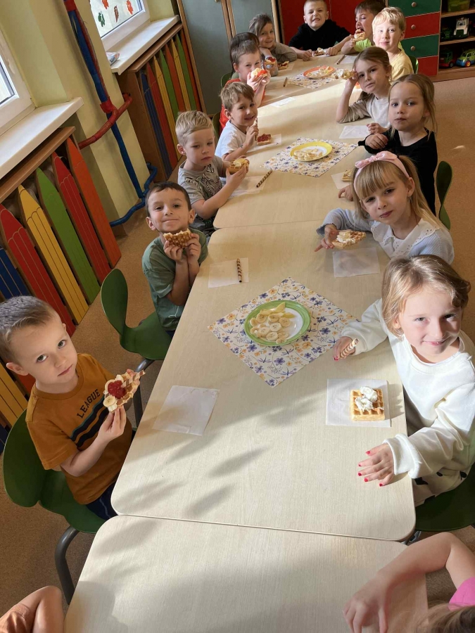Nasze przedszkolaki zajadały się świeżo upieczonymi goframi. Dzieci same dekorowały chrupiące, ciepłe gofry ulubionymi dodatkami - dżemem, bitą śmietaną oraz owocami.