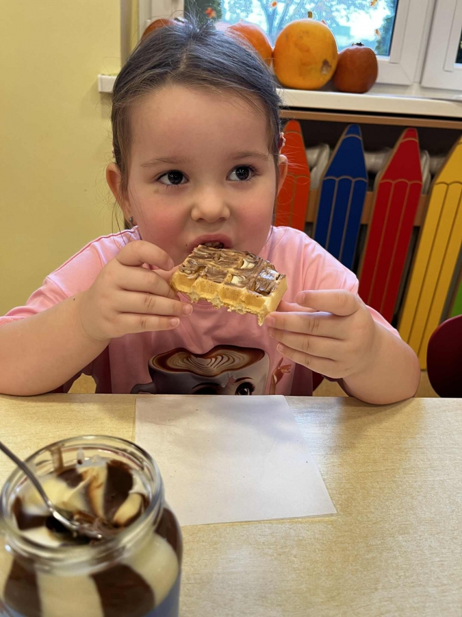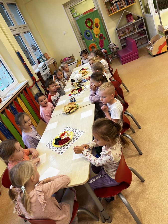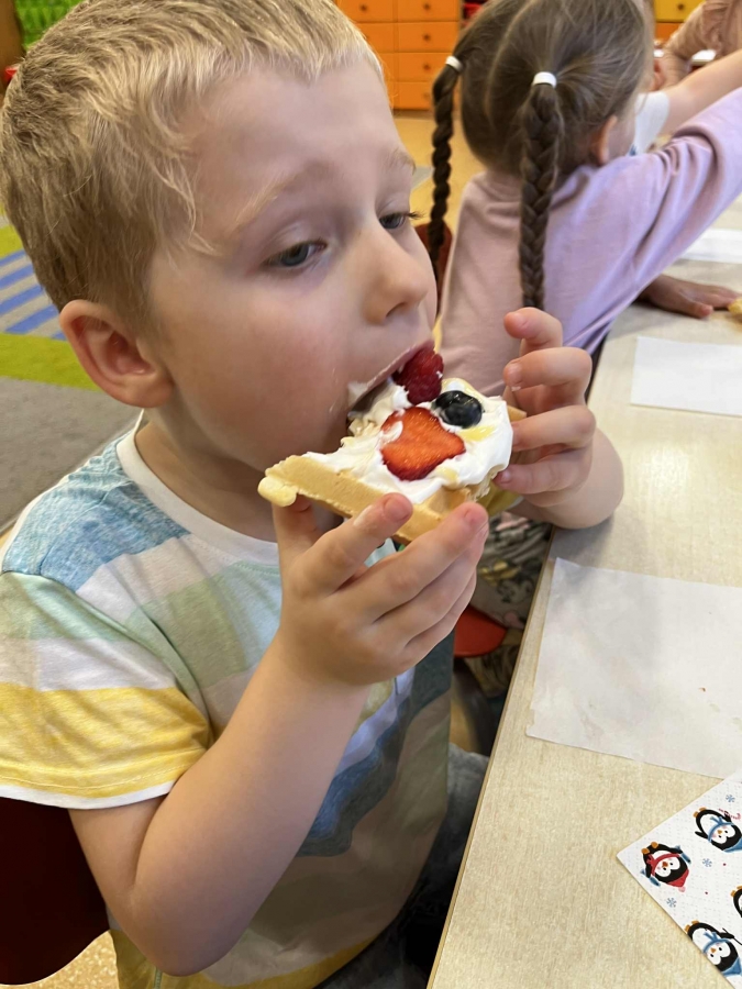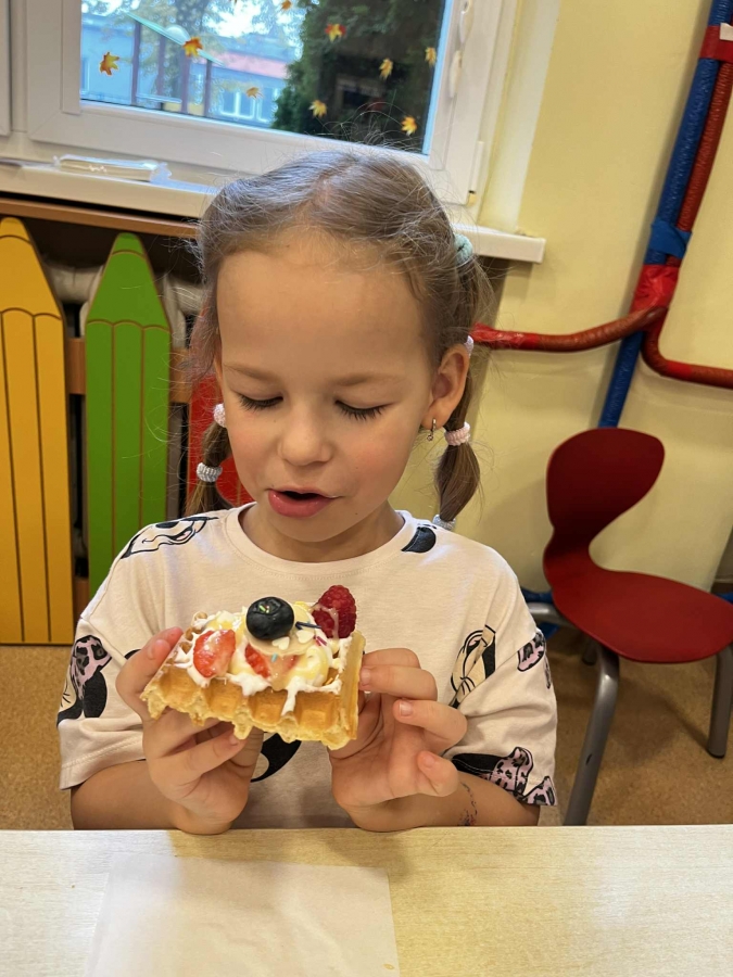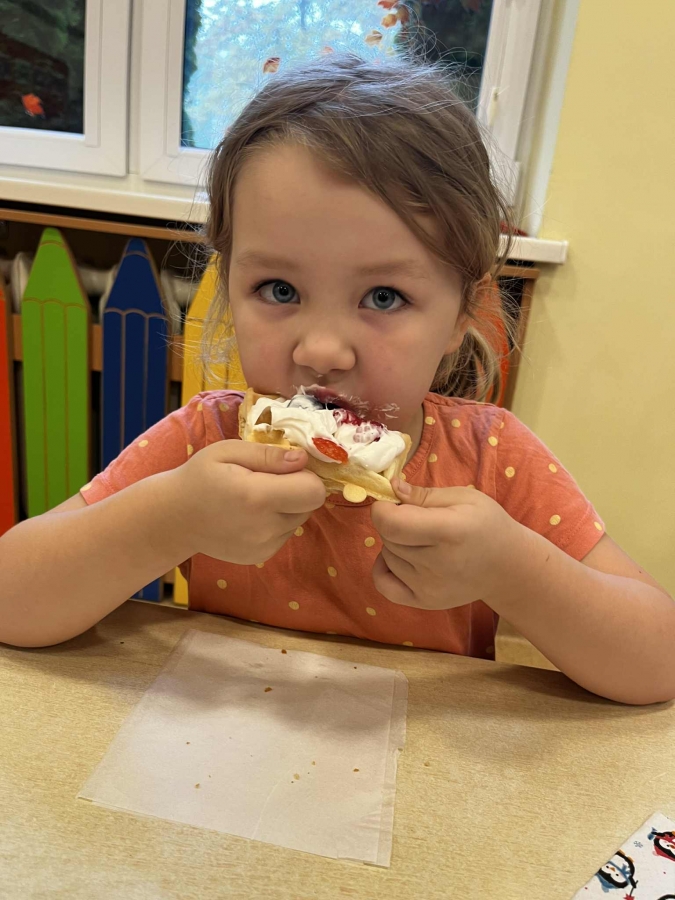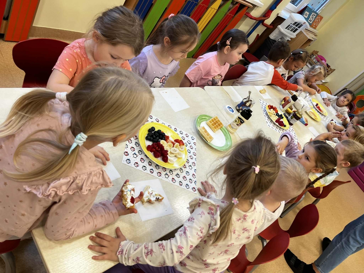 Grupa Biedronki miała dziś prawdziwie pyszny i pełen emocji dzień. Dzieci dekorowały przygotowane wcześniej gofry, korzystając z dodatków przyniesionych przez siebie i kolegów. Na stole pojawiły się kolorowe owoce, dżemiki, Nutella, bita śmietana, różne sosy oraz posypki, które pozwoliły każdemu stworzyć swoją wyjątkową i smakowitą kompozycję.