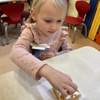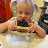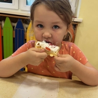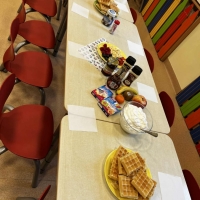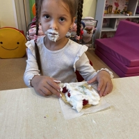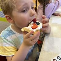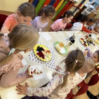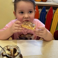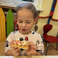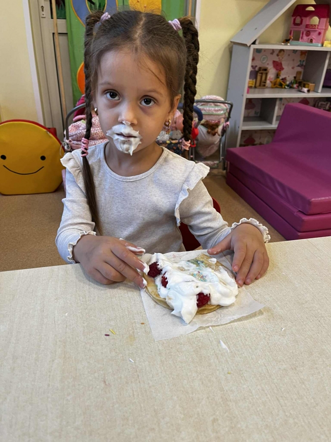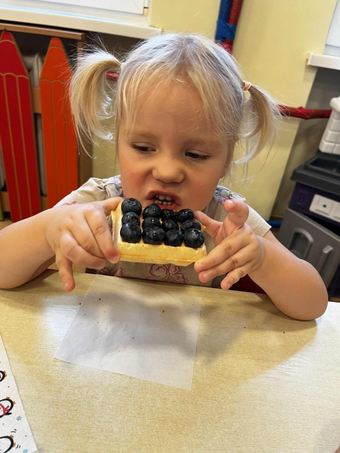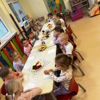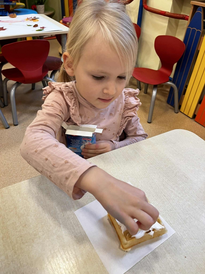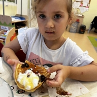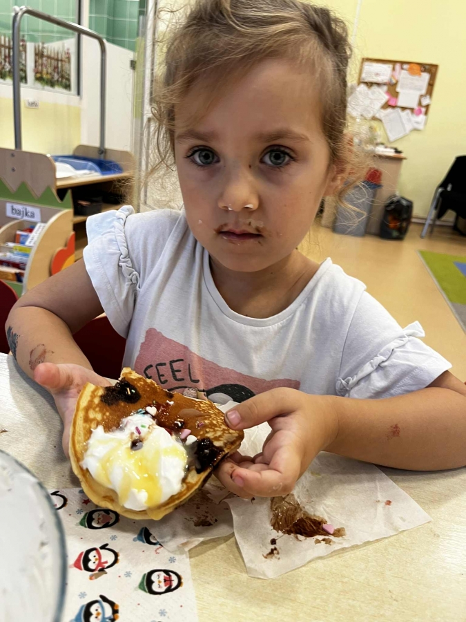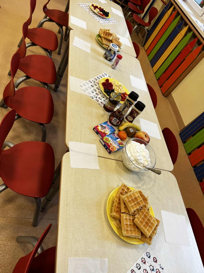 Grupa Biedronki miała dziś prawdziwie pyszny i pełen emocji dzień. Dzieci dekorowały przygotowane wcześniej gofry, korzystając z dodatków przyniesionych przez siebie i kolegów. Na stole pojawiły się kolorowe owoce, dżemiki, Nutella, bita śmietana, różne sosy oraz posypki, które pozwoliły każdemu stworzyć swoją wyjątkową i smakowitą kompozycję.