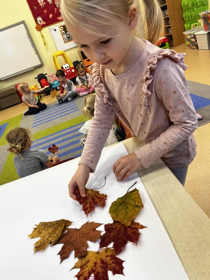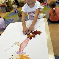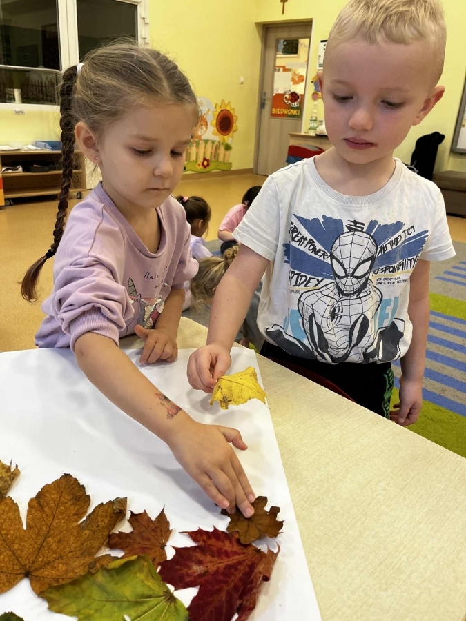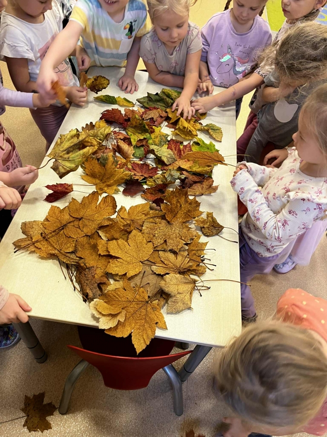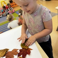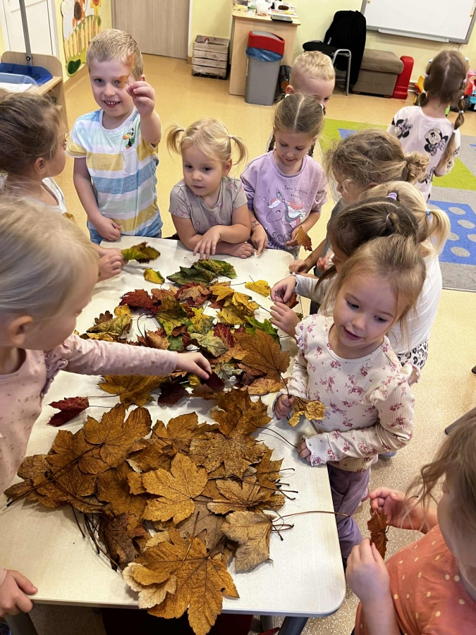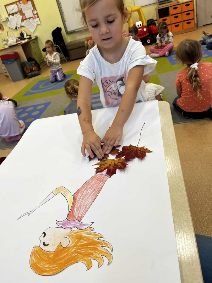 Dziś stworzyliśmy wyjątkową, wspólną pracę plastyczną pod tytułem „Pani Jesień”. Dzieci pokolorowały jej włosy, głowę, rękę oraz górę sukni, a następnie wspólnie ozdabiały dużą spódnicę wykonaną z prawdziwych, jesiennych liści. Każdy listek był starannie dobrany i umieszczony tak, aby nadać jesiennej sukni bogactwo kolorów i faktur.