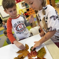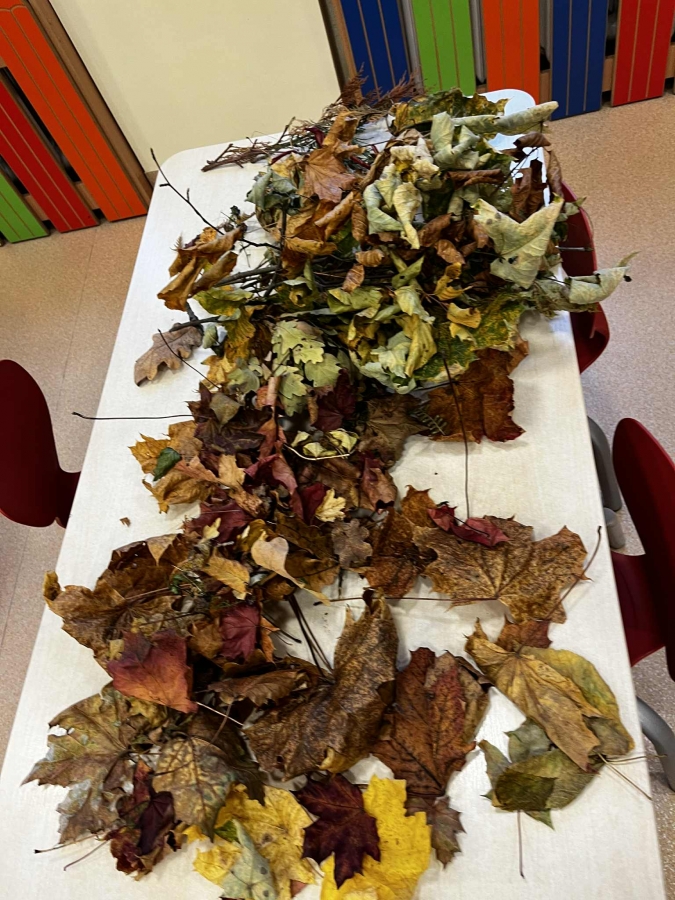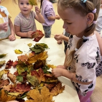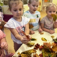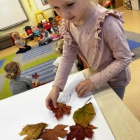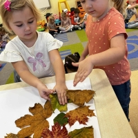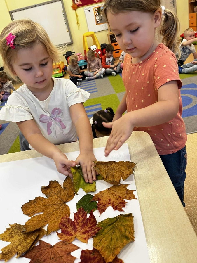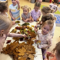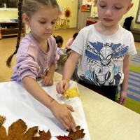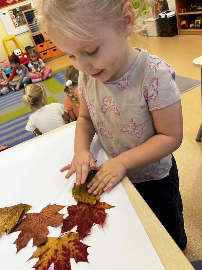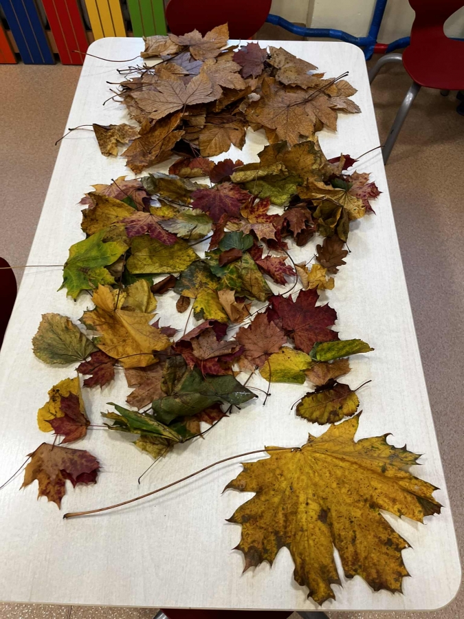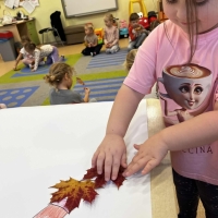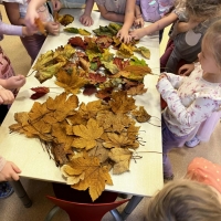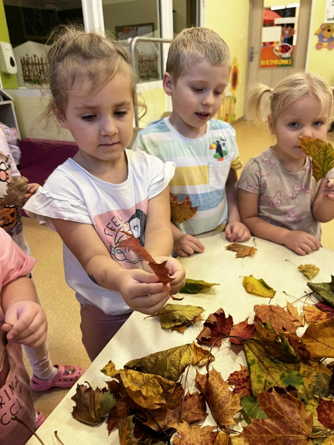 Dziś stworzyliśmy wyjątkową, wspólną pracę plastyczną pod tytułem „Pani Jesień”. Dzieci pokolorowały jej włosy, głowę, rękę oraz górę sukni, a następnie wspólnie ozdabiały dużą spódnicę wykonaną z prawdziwych, jesiennych liści. Każdy listek był starannie dobrany i umieszczony tak, aby nadać jesiennej sukni bogactwo kolorów i faktur.