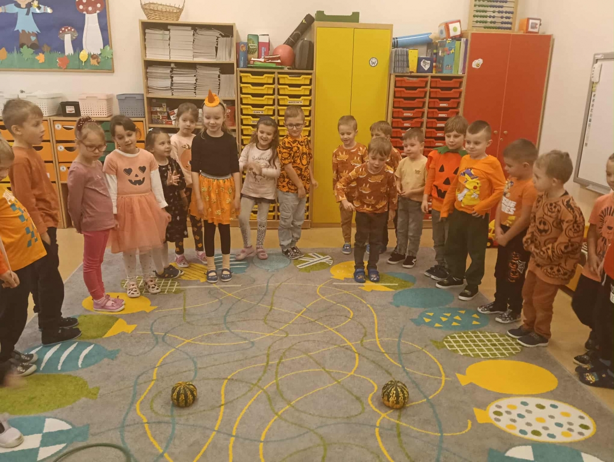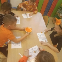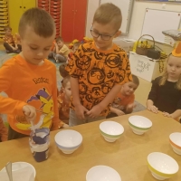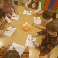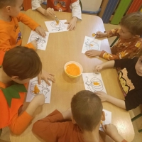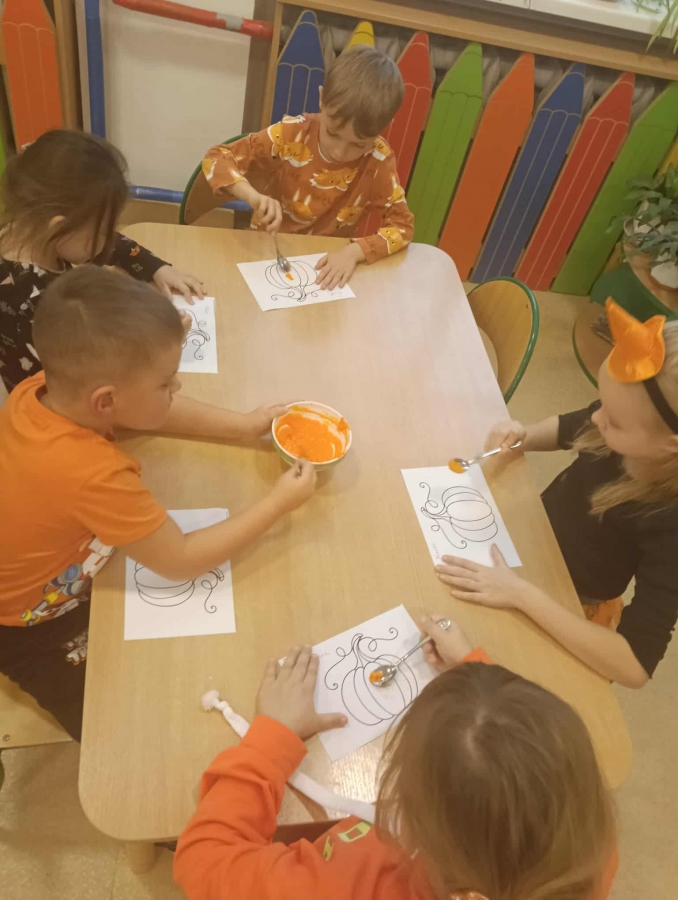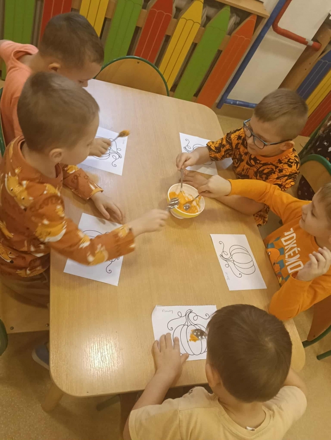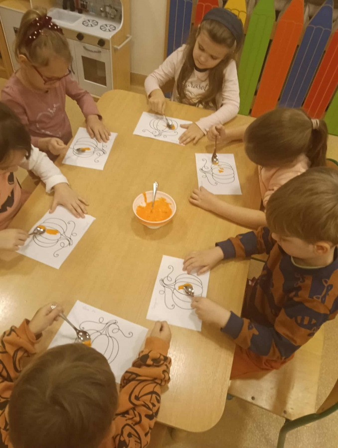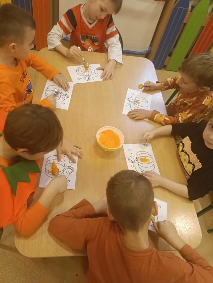 Dzieci przyszły ubrane w odcienie pomarańczu. W specjalnej ramce w kształcie dyni powstawały pamiątkowe zdjęcia. Nie zabrakło także wesołych zabaw przy muzyce z dynią i dyniowych konkurencji ruchowych. W części plastycznej dzieci przygotowały własne rosnące farby, a następnie malowały łyżeczkami, tworząc niepowtarzalne dynie. Gotowe prace piekliśmy w piekarniku, by zobaczyć, jak farby „rosną” i nabierają niezwykłej faktury.