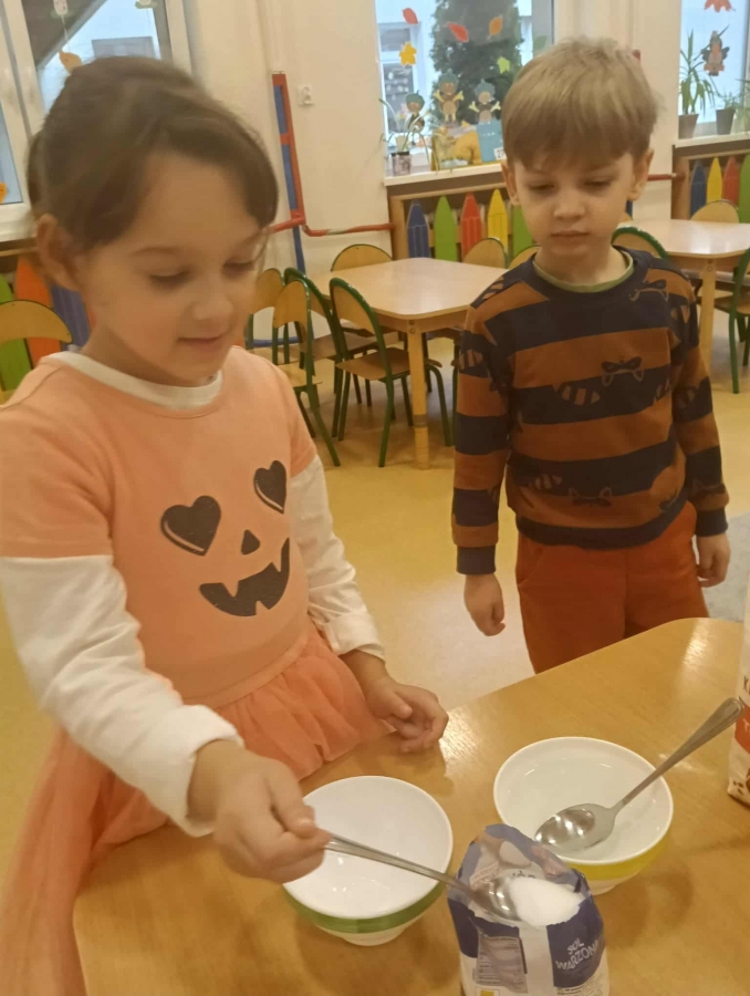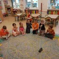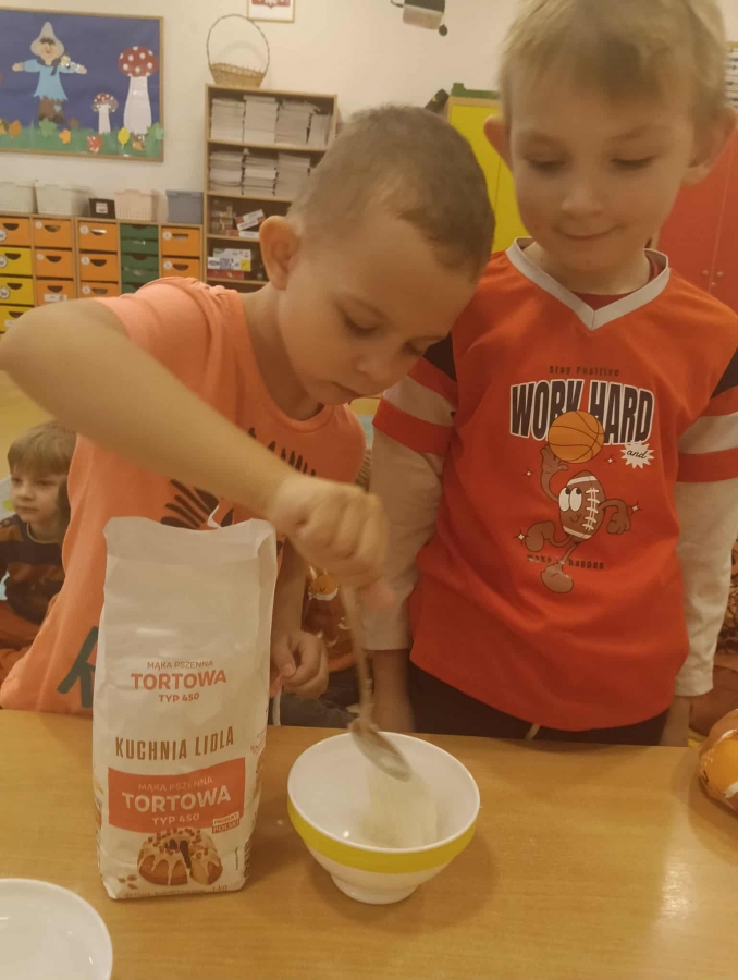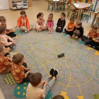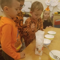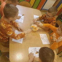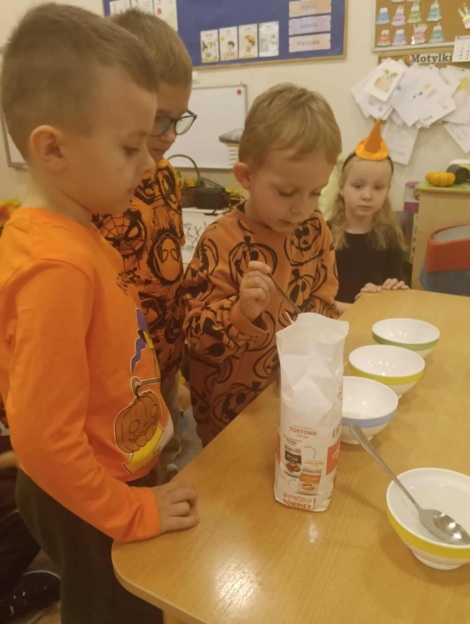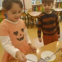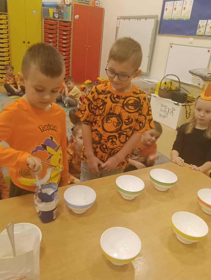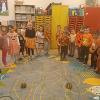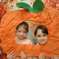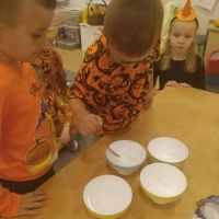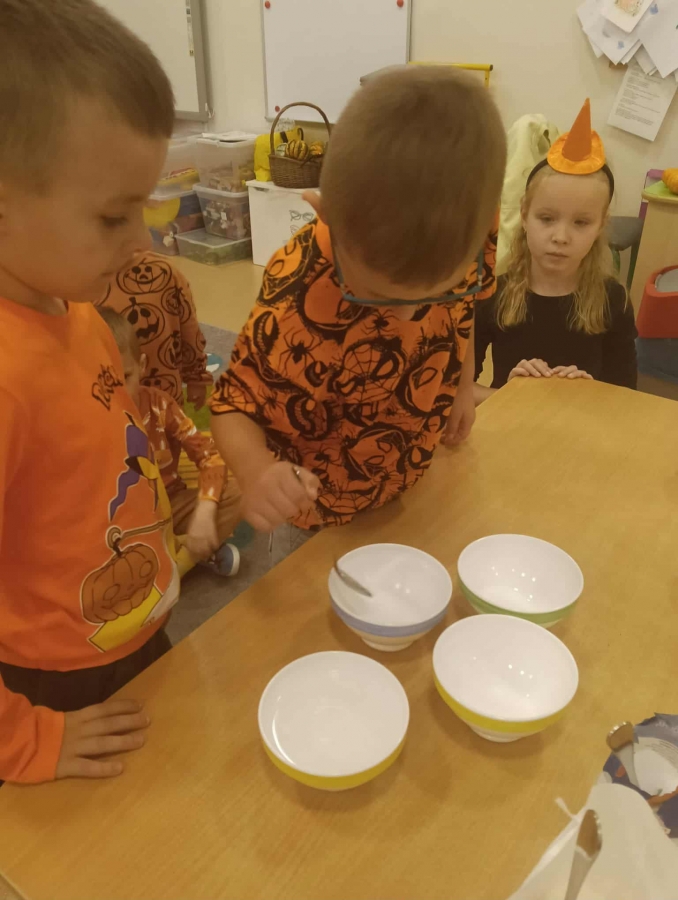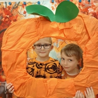 Dzieci przyszły ubrane w odcienie pomarańczu. W specjalnej ramce w kształcie dyni powstawały pamiątkowe zdjęcia. Nie zabrakło także wesołych zabaw przy muzyce z dynią i dyniowych konkurencji ruchowych. W części plastycznej dzieci przygotowały własne rosnące farby, a następnie malowały łyżeczkami, tworząc niepowtarzalne dynie. Gotowe prace piekliśmy w piekarniku, by zobaczyć, jak farby „rosną” i nabierają niezwykłej faktury.