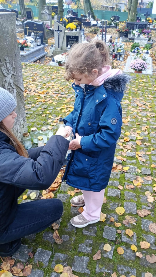ŚWIĘTO WSZYSTKICH ŚWIĘTYCH 03 listopada 2025 | Opublikowane w: Jeżyki 2025/2026 ???? „Płomień pamięci” Na cmentarzu cicho, wiatr liśćmi zamiata, migają światełka — to znaki od świata.Każdy płomień mówi: „Pamiętam, wspominam, choć już cię nie widzę, w sercu cię zatrzymam.”