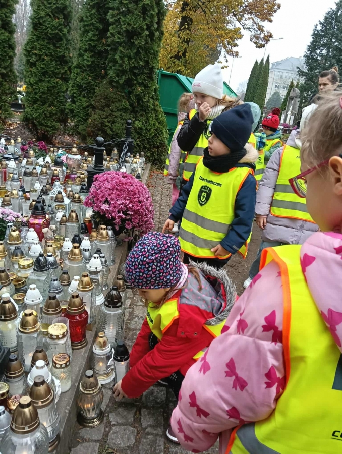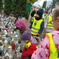 Odwiedzamy cmentarz 03 listopada 2025 | Opublikowane w: Motylki 2025/2026 Podczas spaceru odwiedziliśmy pobliski cmentarz, aby pamiętać o osobach, które odeszły. Przy grobach zatrzymaliśmy się na chwilę, żeby pomyśleć o tym, co ważne i zobaczyć symbole pamięci – zapalone znicze, piękne kwiaty i krzyże.