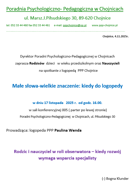Zaproszenie do Poradni Psychologiczno-Pedagogicznej w Chojnicach 12 listopada 2025 | Opublikowane w: Aktualności