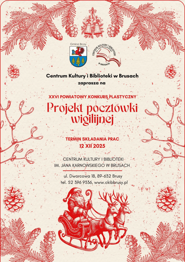Centrum Kultury i Biblioteki im. Jana Karnowskiego w Brusach ogłasza kolejną edycję Powiatowego Konkursu Plastycznego „Projekt pocztówki wigilijnej”. Konkurs skierowany jest do dzieci i młodzieży z powiatu chojnickiego – uczniów przedszkoli, szkół podstawowych, szkół ponadpodstawowych oraz podopiecznych świetlic i ośrodków terapii zajęciowej.