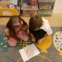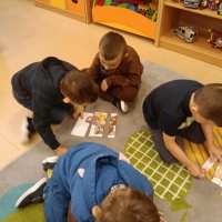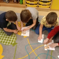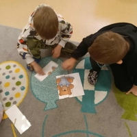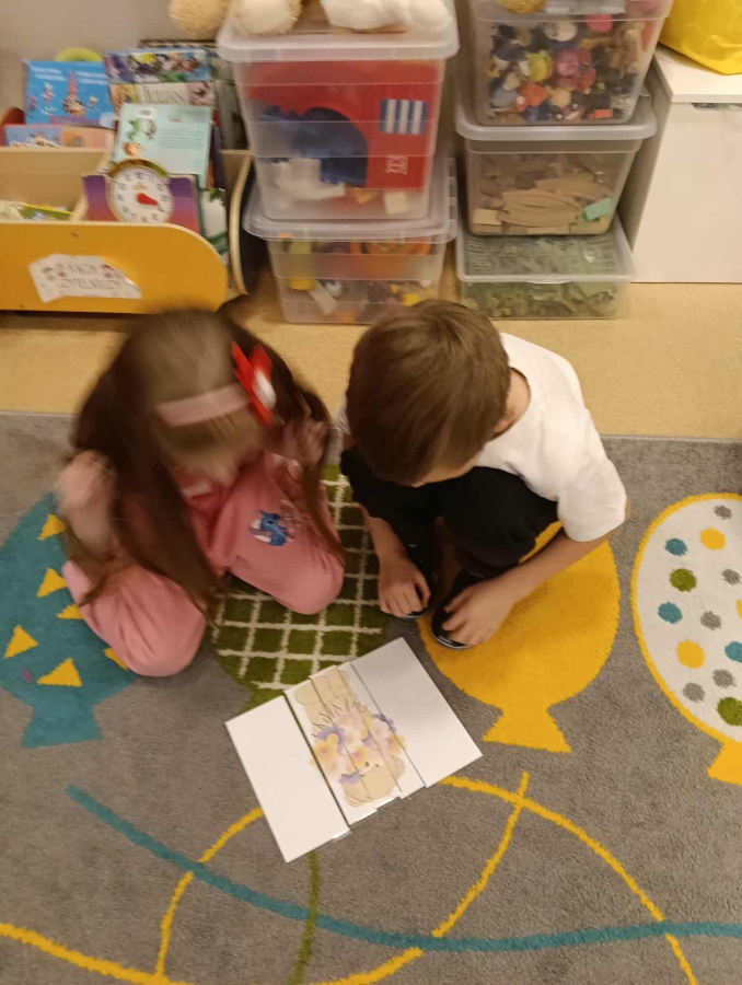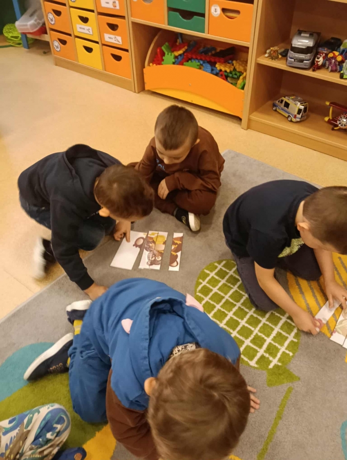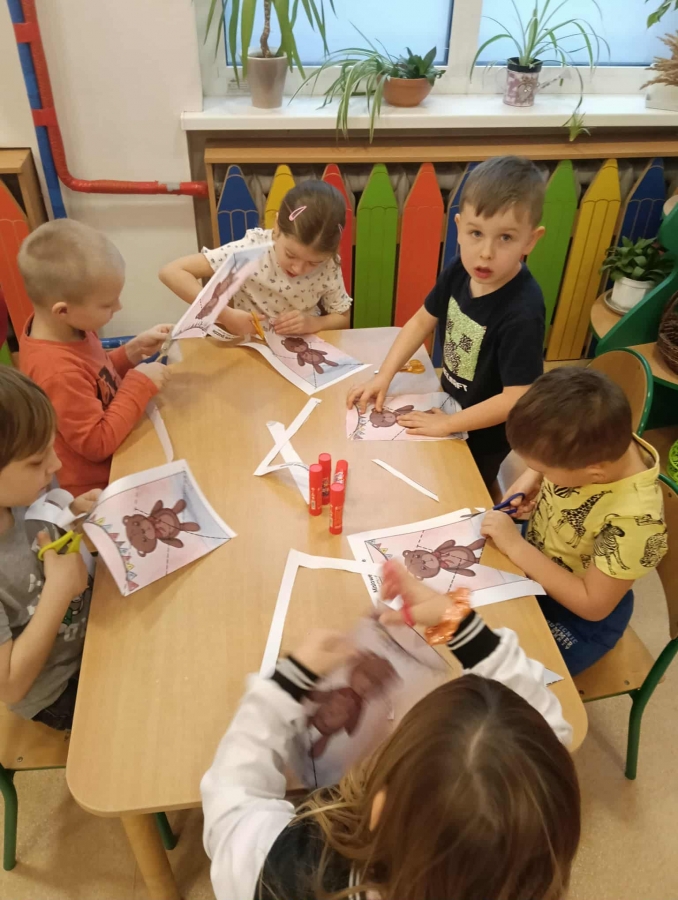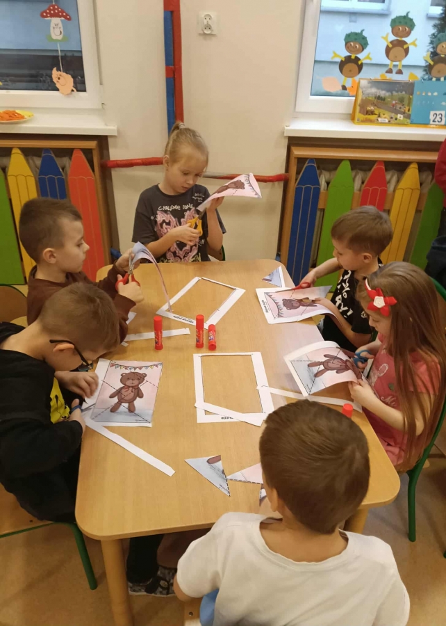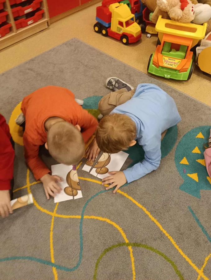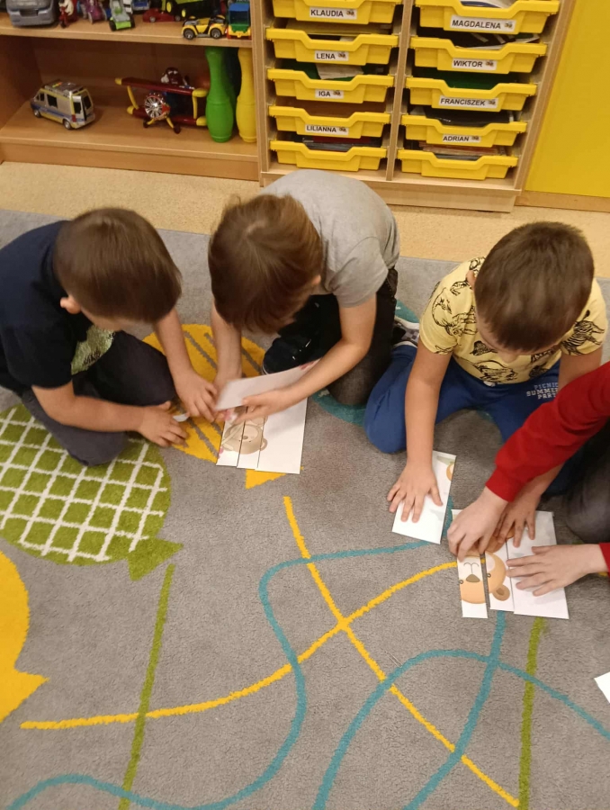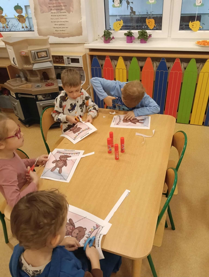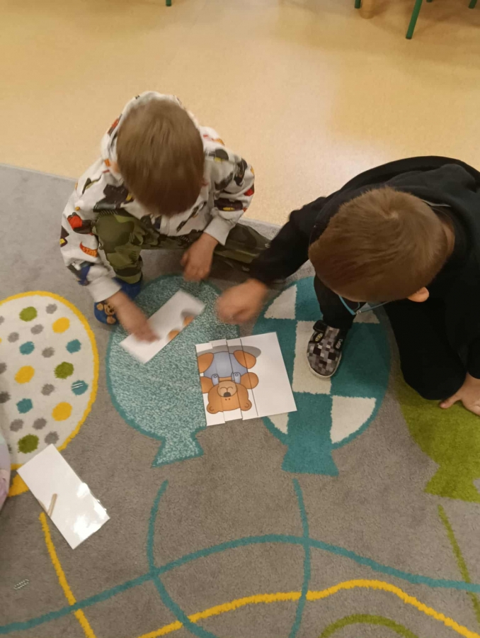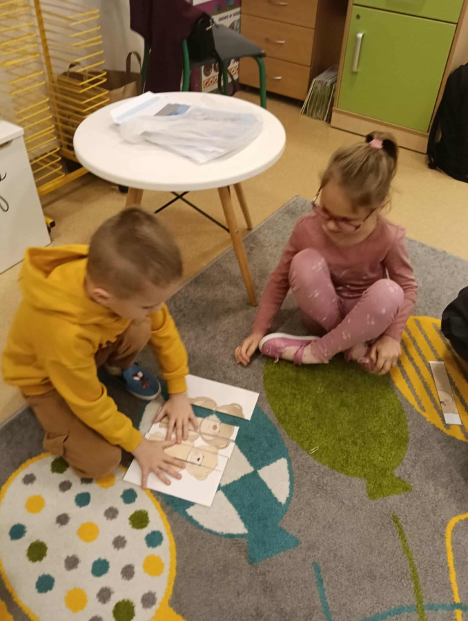 - układały misiowe puzzle, ćwicząc spostrzegawczość i koordynację wzrokowo–ruchową,