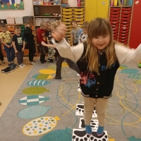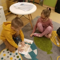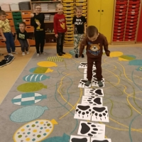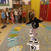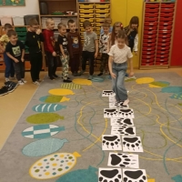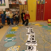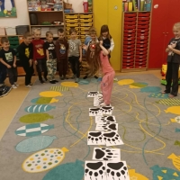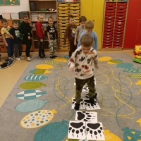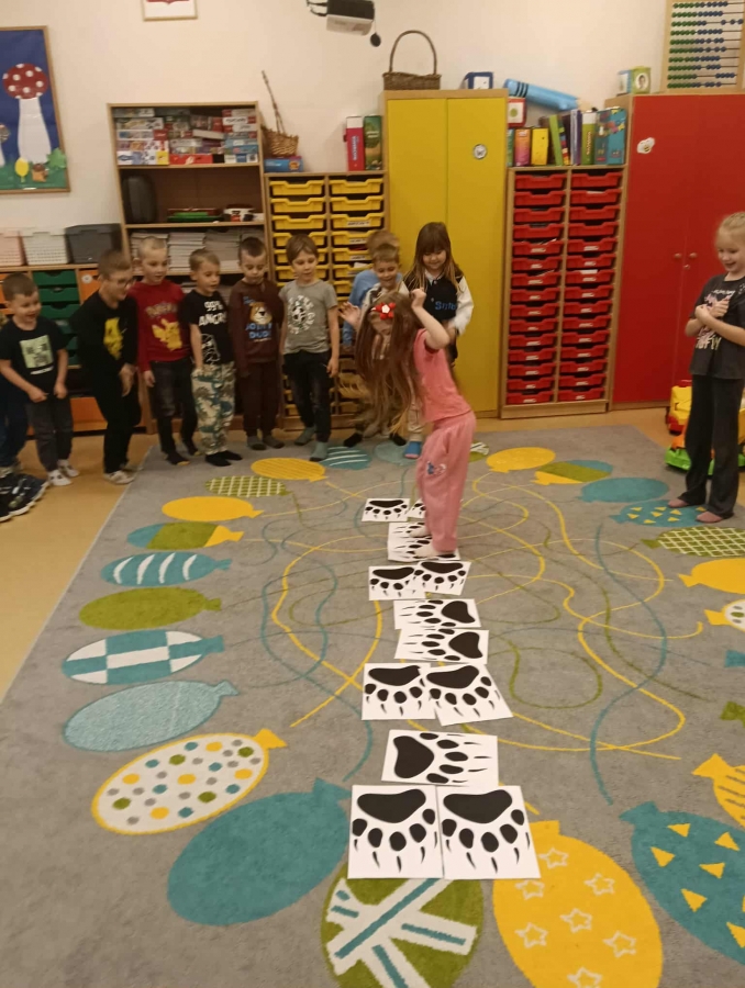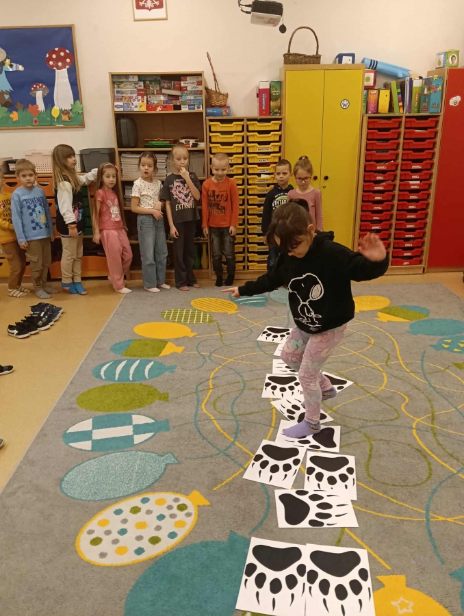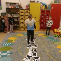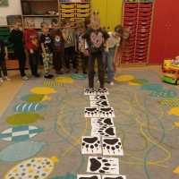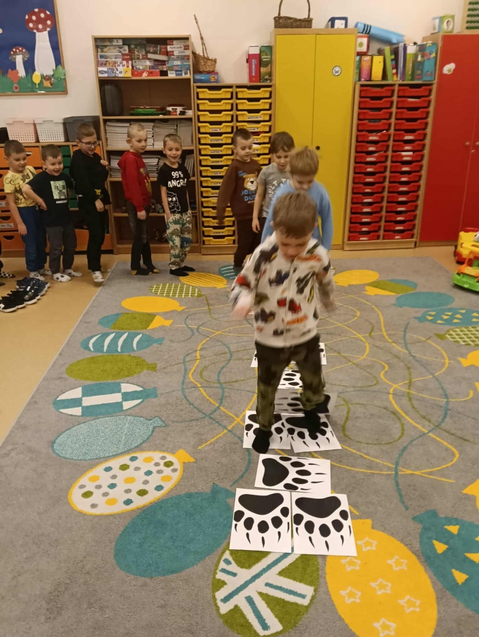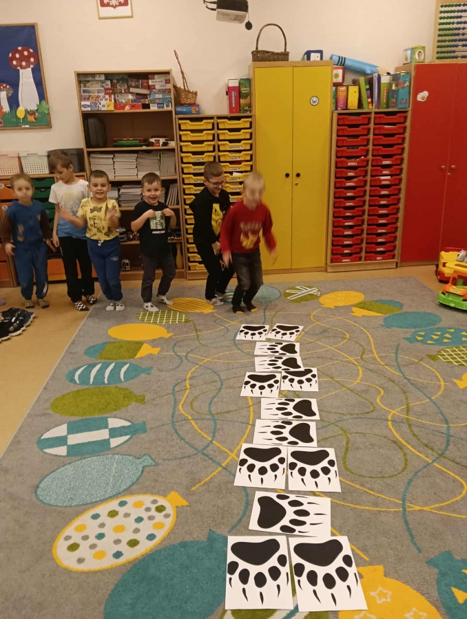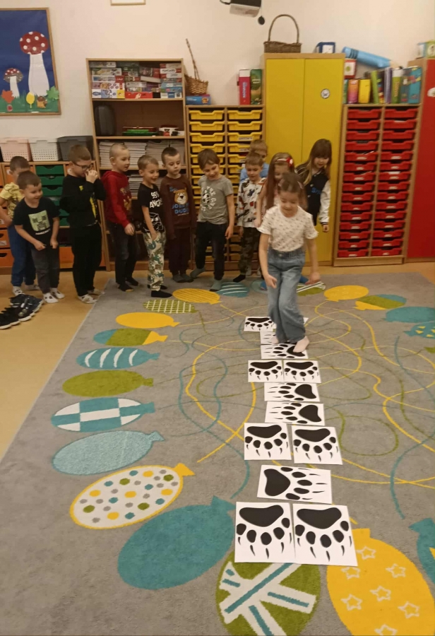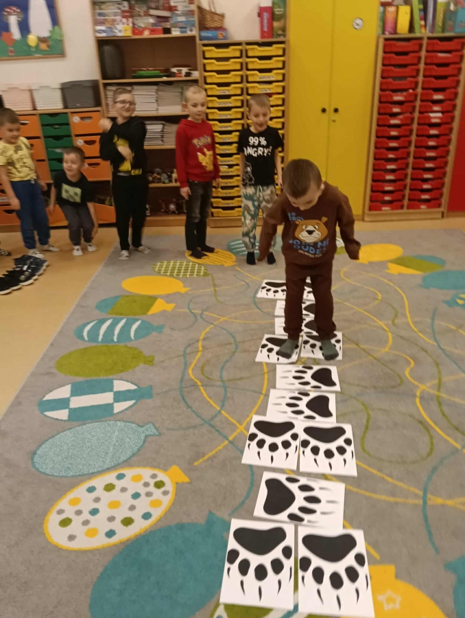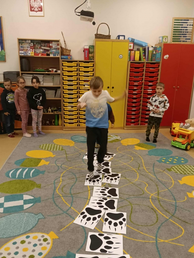 - skakały po wydrukowanych śladach misia, wykonując zadania ruchowe zgodnie z ich kolejnością.