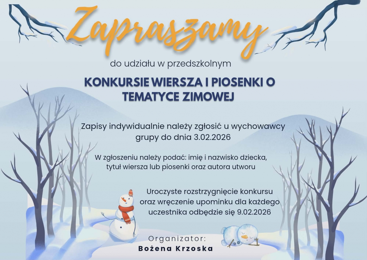 Serdecznie zapraszamy do udziału w przedszkolnym Konkursie Wiersza i Piosenki Zimowej.