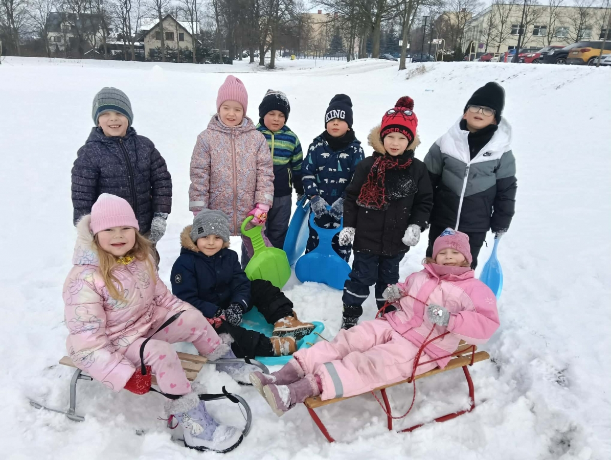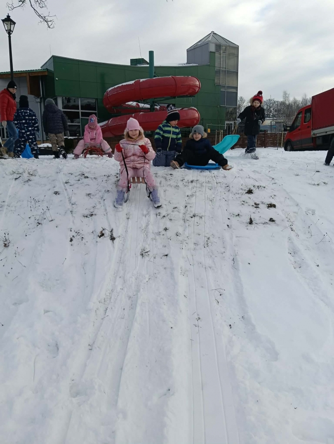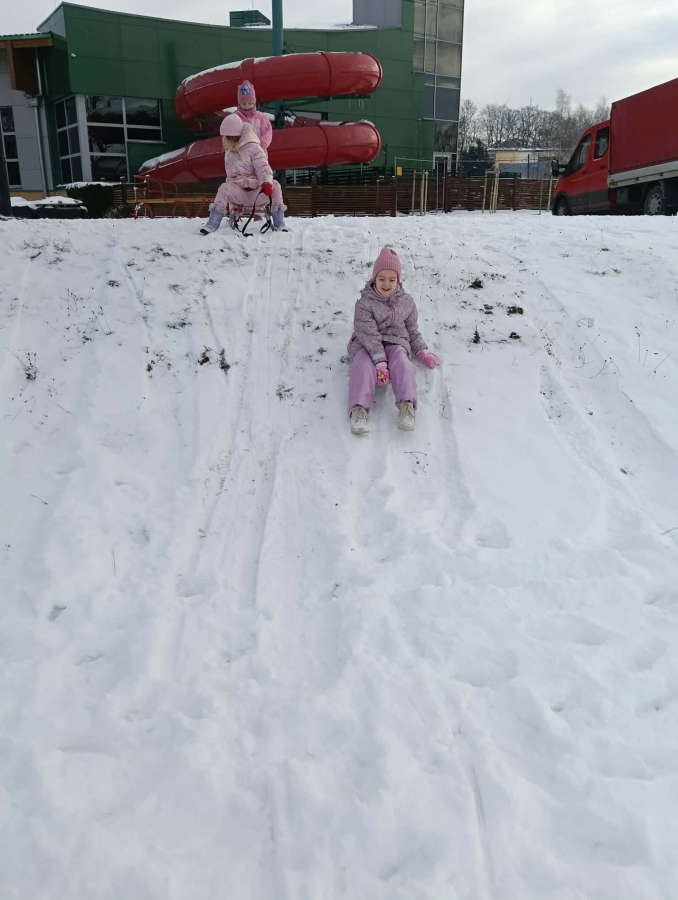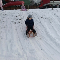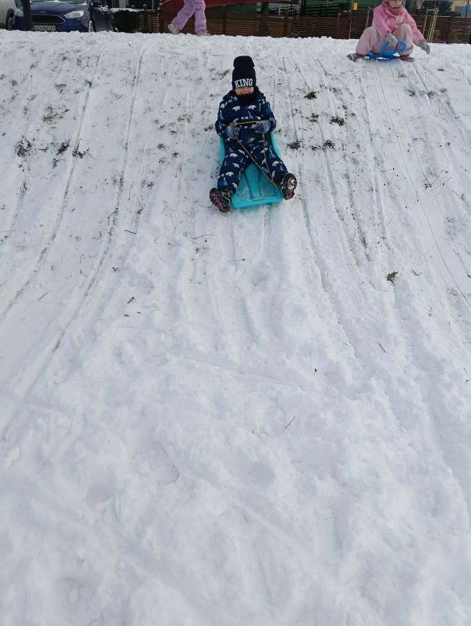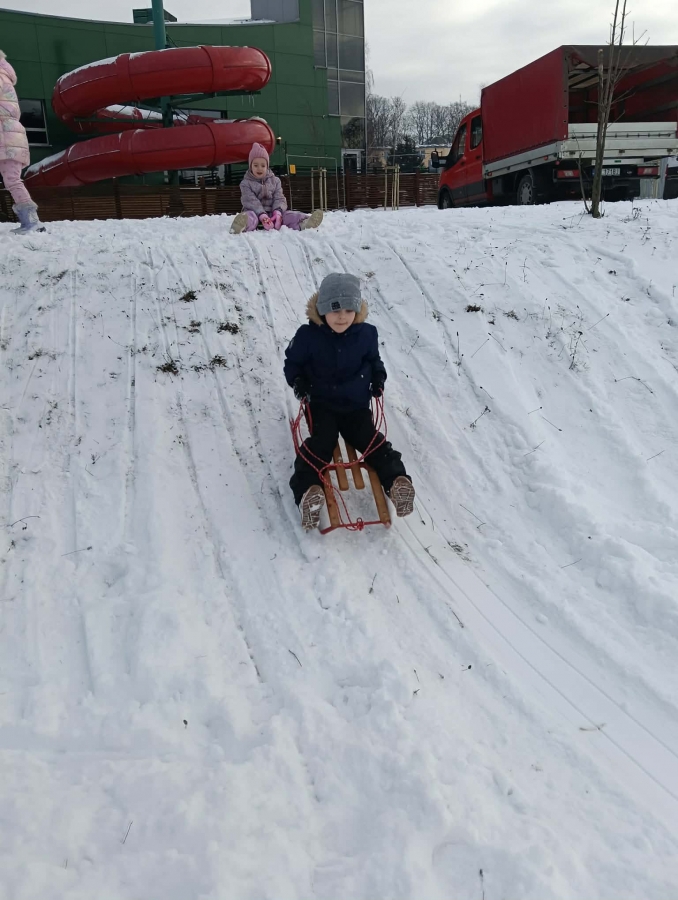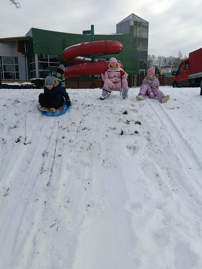 Przedszkolaki brały udział w zimowych zabawach na śniegu. W czasie pobytu dzieci korzystały z jabłuszek, ślizgów oraz sanek, ucząc się bezpiecznego zachowania na górce. Zabawy na świeżym powietrzu sprawiły dzieciom wiele radości, sprzyjały integracji grupy oraz rozwijały sprawność ruchową.