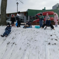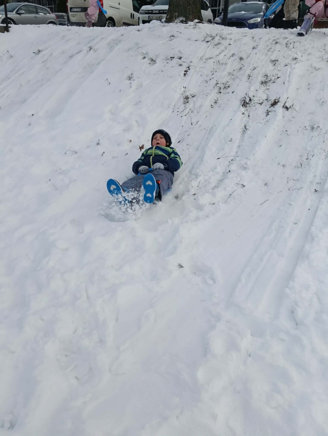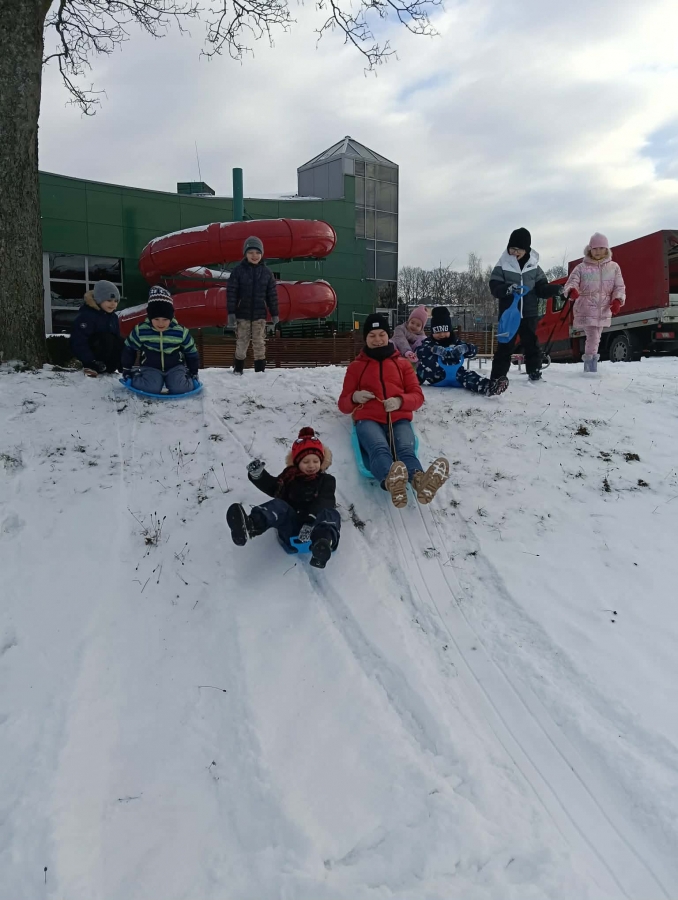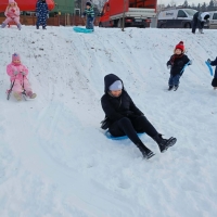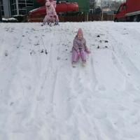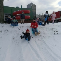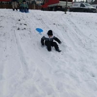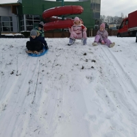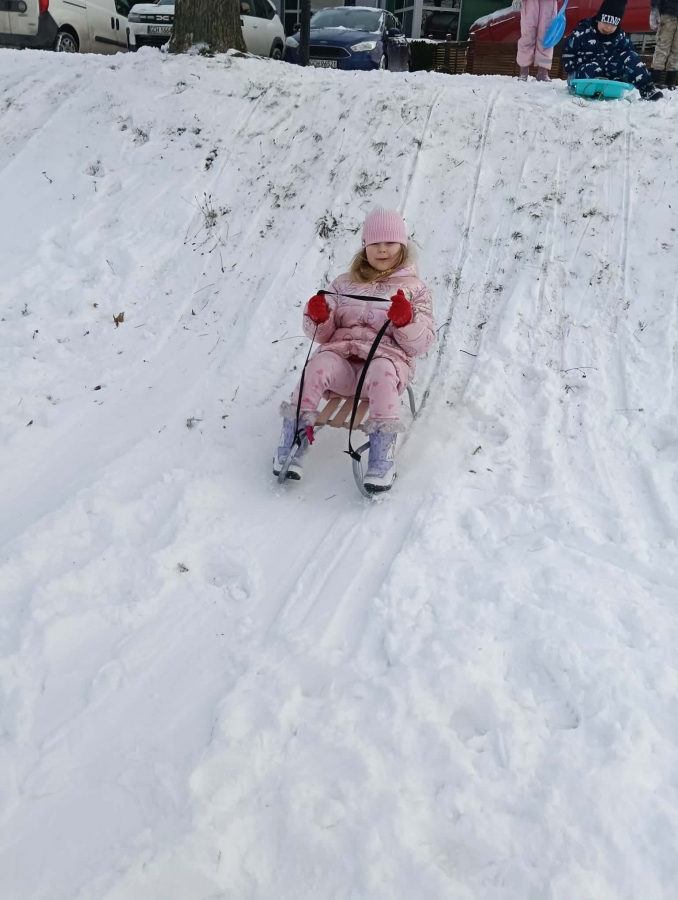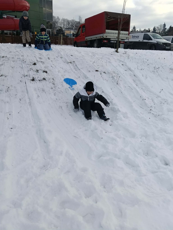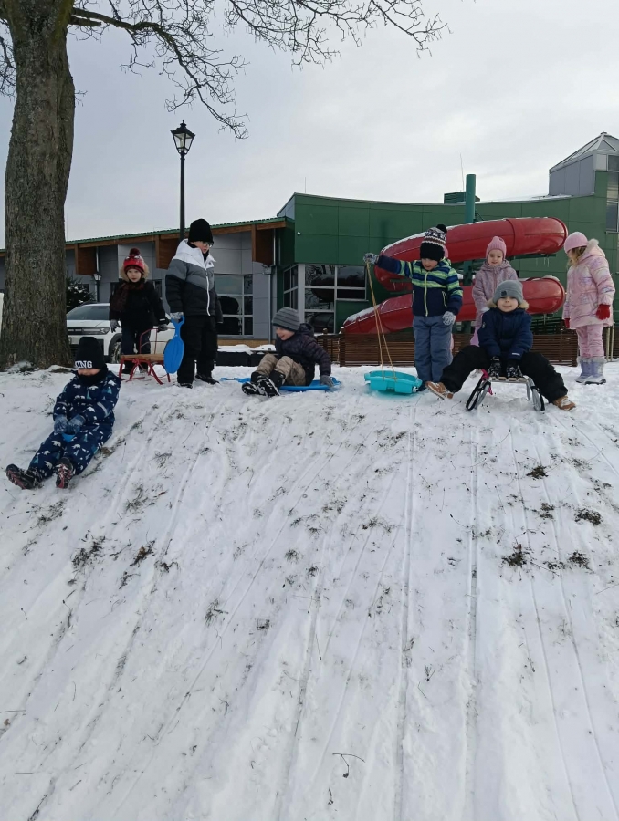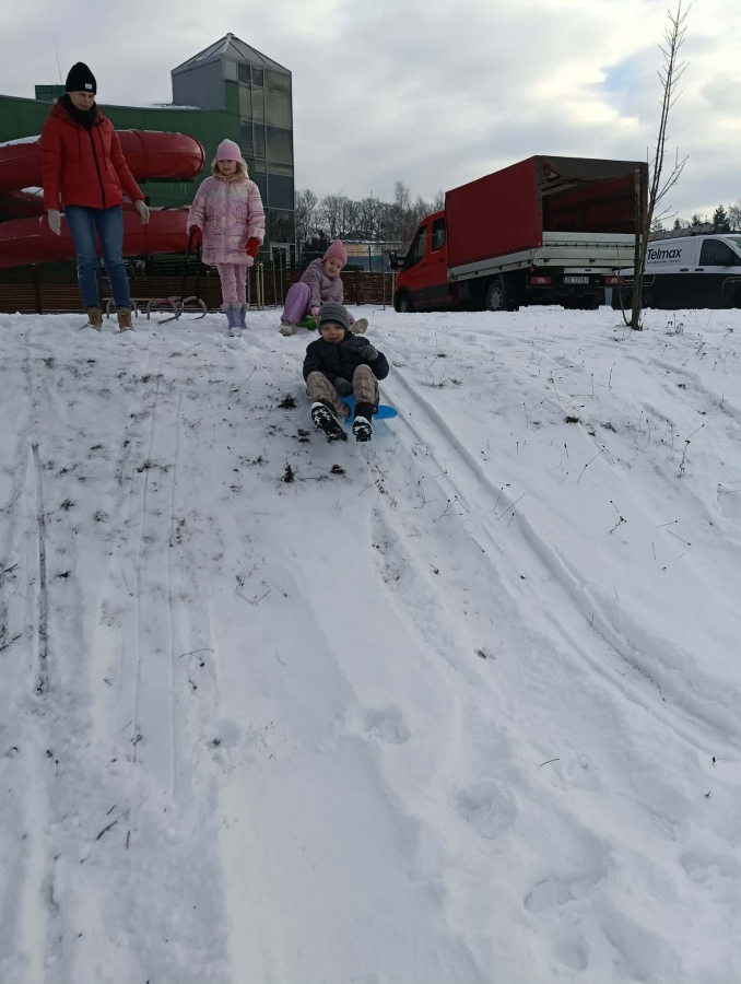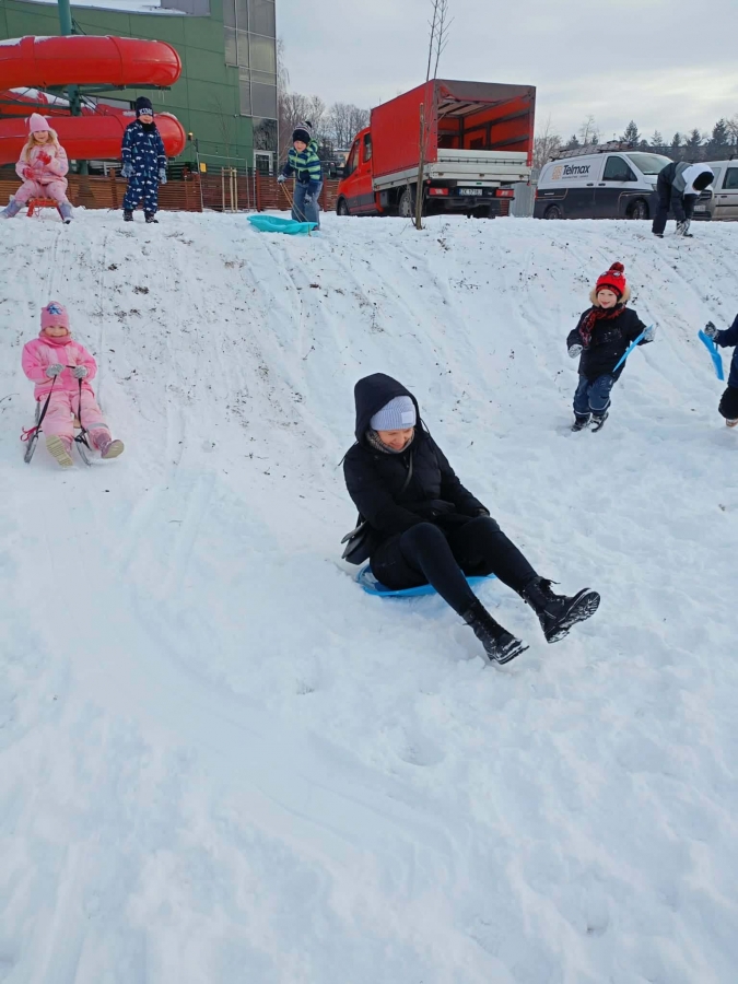 Przedszkolaki brały udział w zimowych zabawach na śniegu. W czasie pobytu dzieci korzystały z jabłuszek, ślizgów oraz sanek, ucząc się bezpiecznego zachowania na górce. Zabawy na świeżym powietrzu sprawiły dzieciom wiele radości, sprzyjały integracji grupy oraz rozwijały sprawność ruchową.