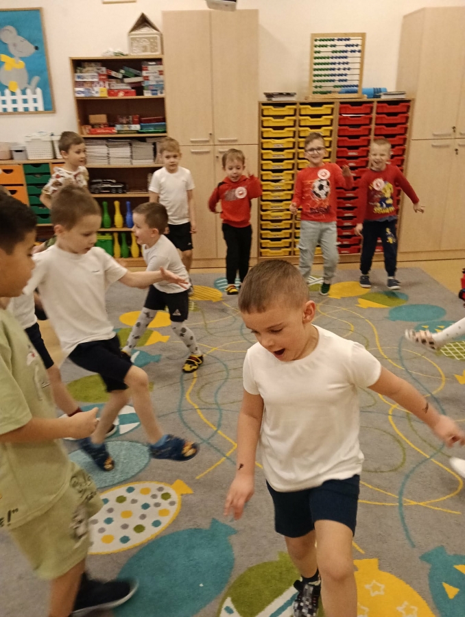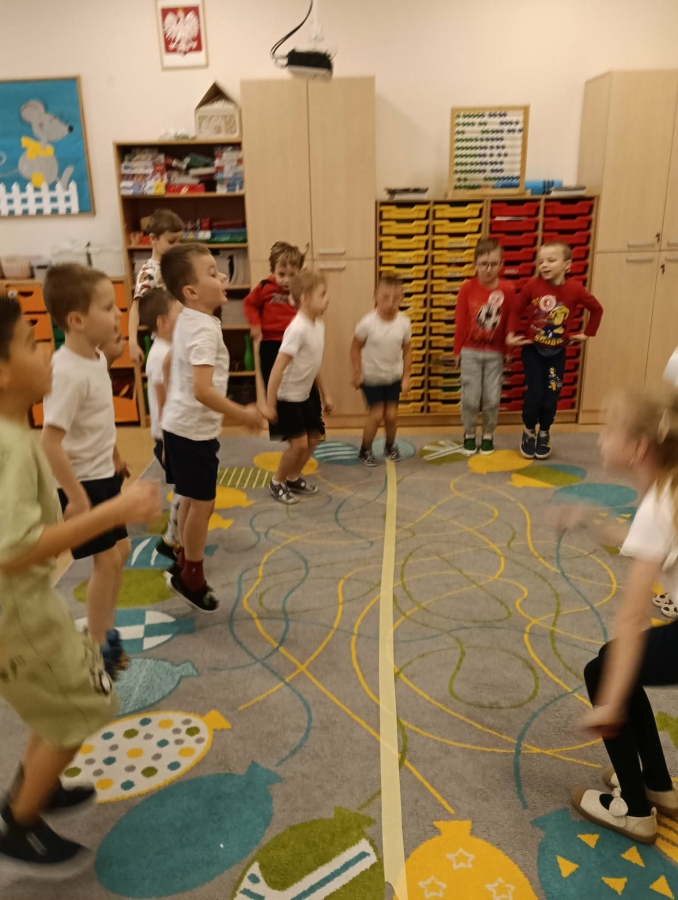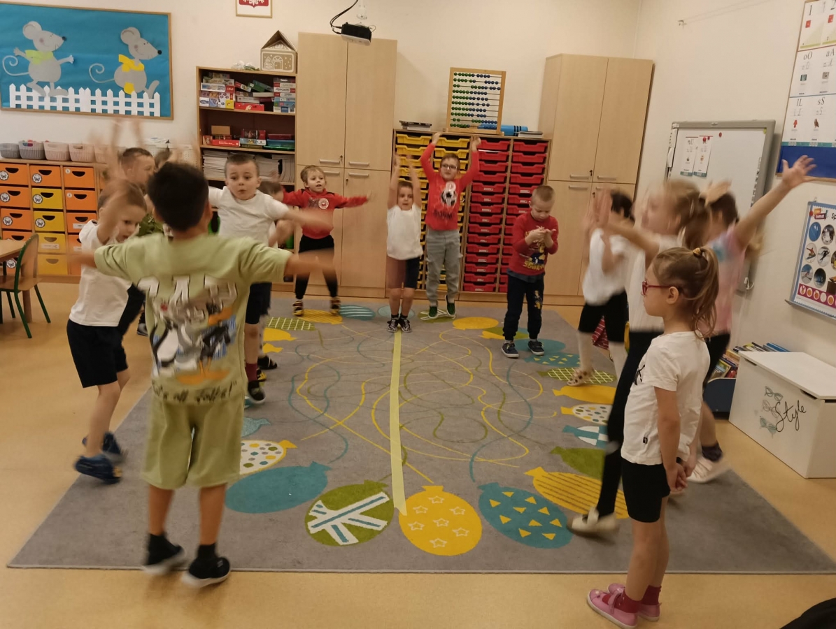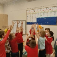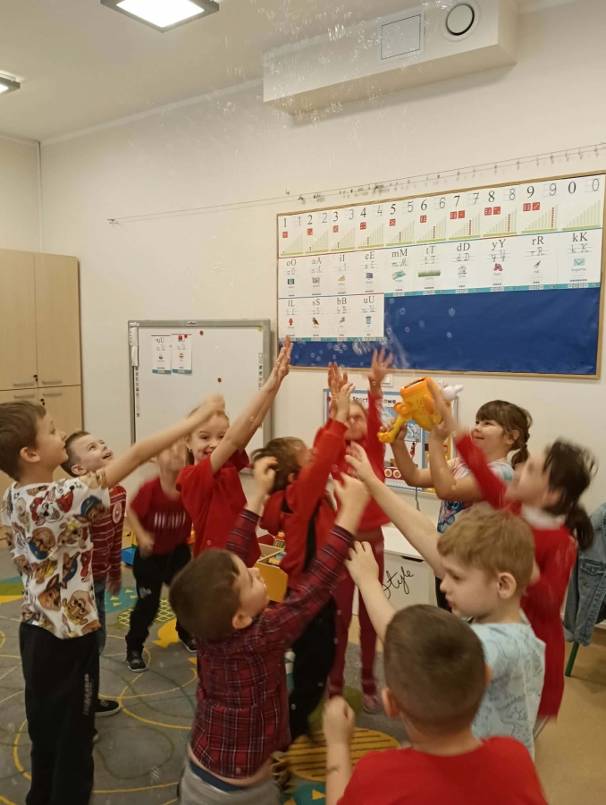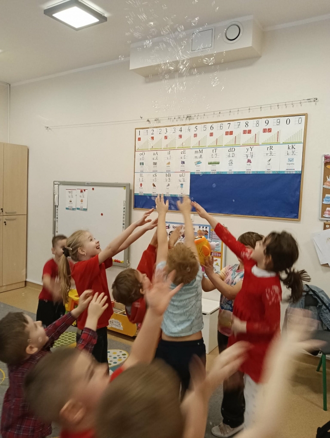 Dzieci brały udział w wspólnych zabawach ruchowych oraz zabawie w łapanie baniek mydlanych, która dostarczyła wszystkim wiele śmiechu.