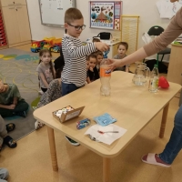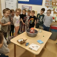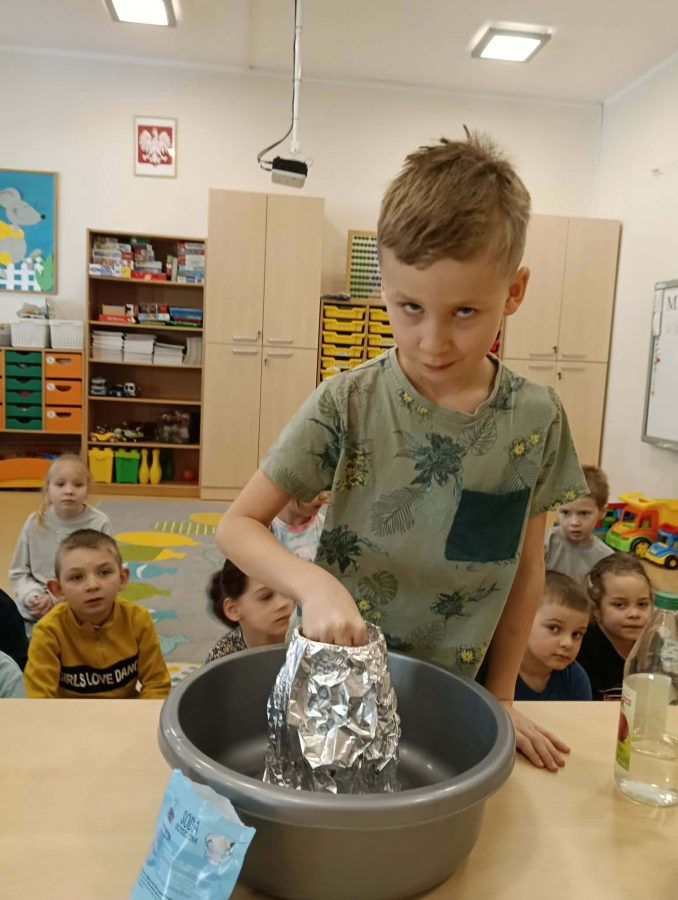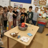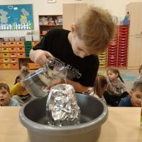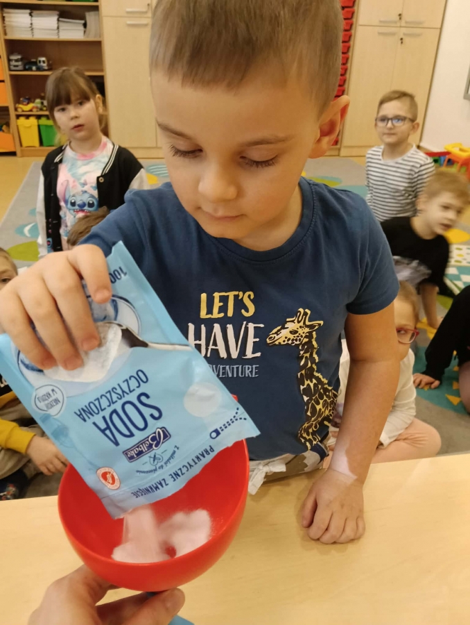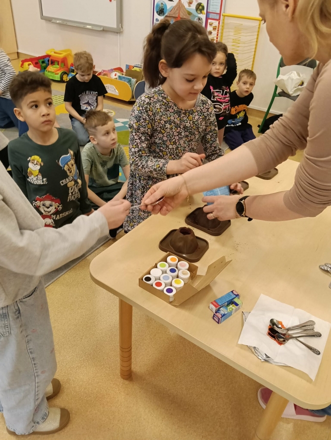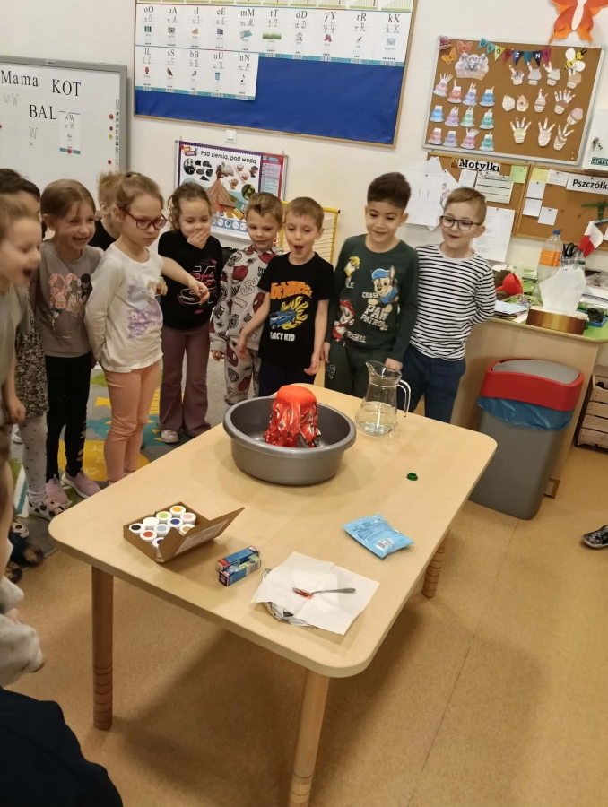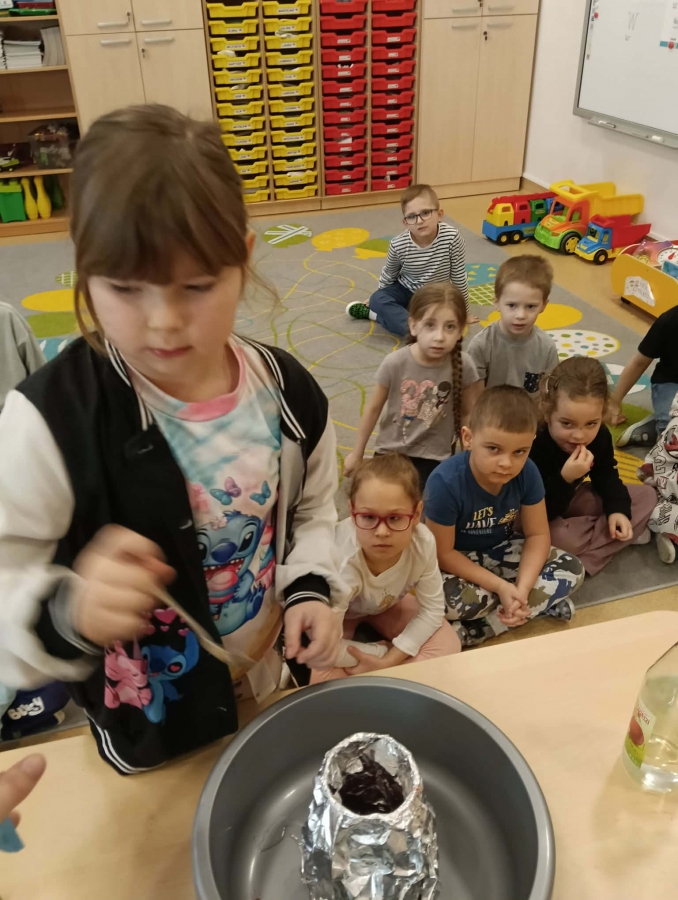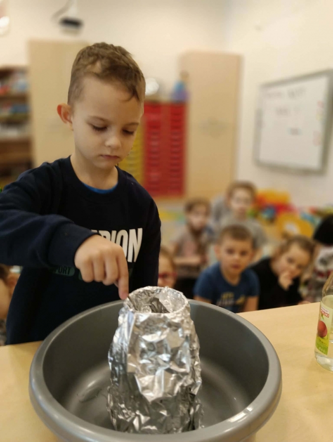Dzieci dowiedziały się, że połączenie octu i sody powoduje reakcję chemiczną, w wyniku której powstaje gaz (dwutlenek węgla). To właśnie ten gaz sprawił, że nasz wulkan „wybuchł”. Eksperyment wzbudził ogromne zainteresowanie i wiele pozytywnych emocji.