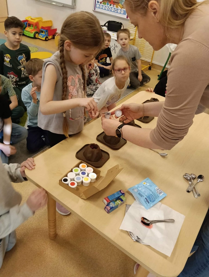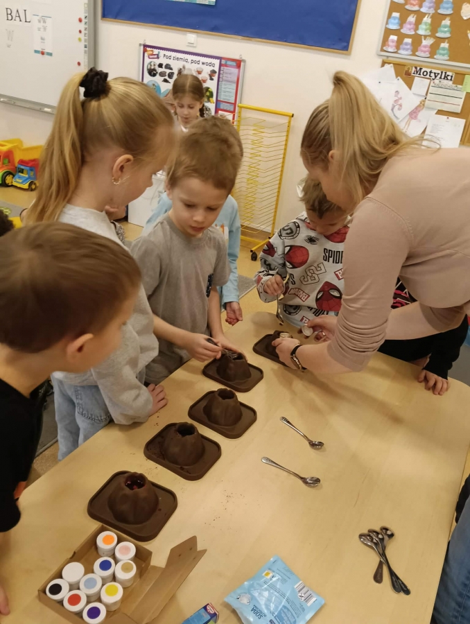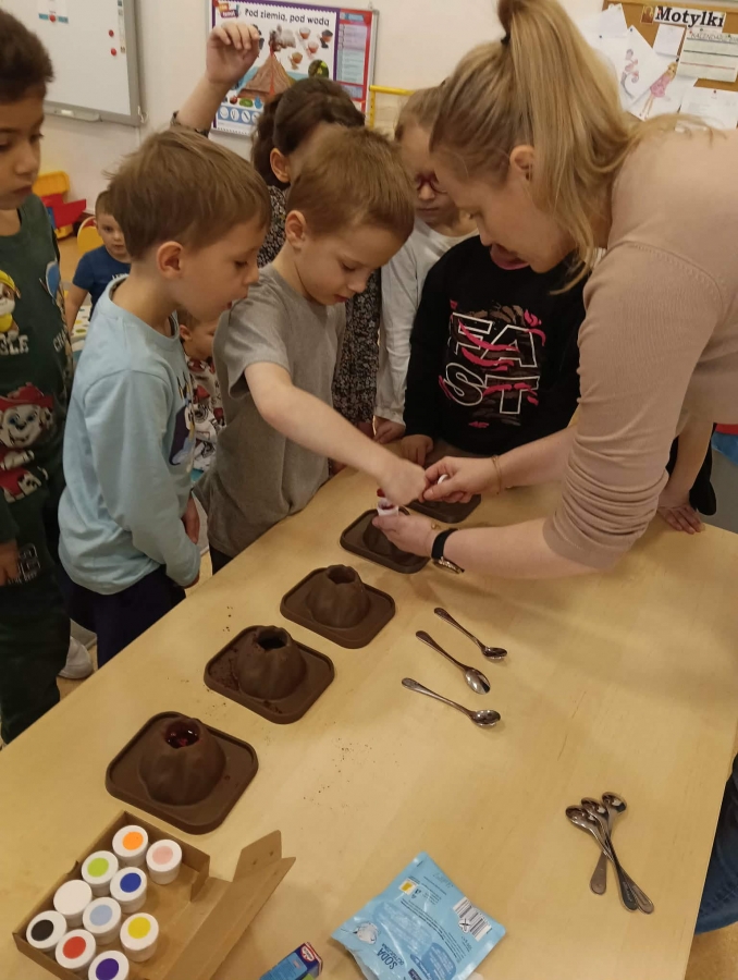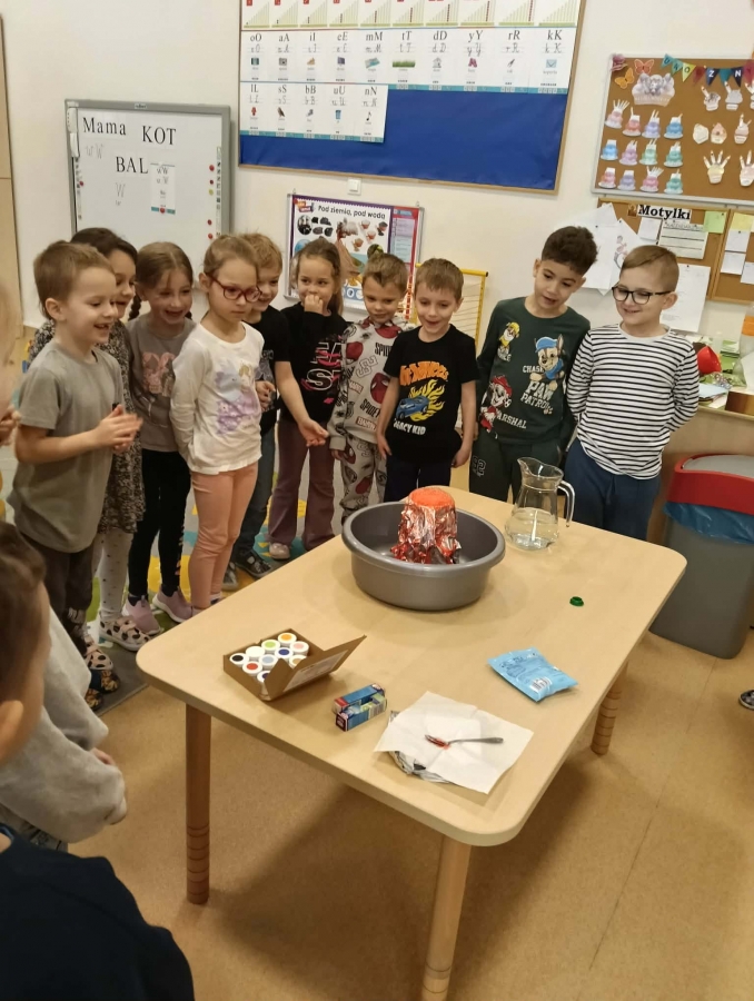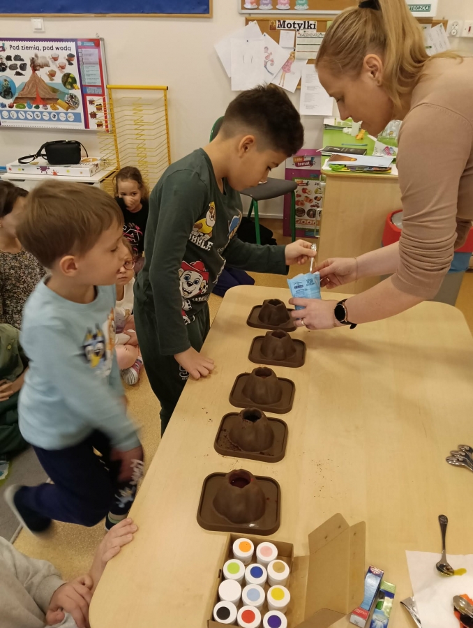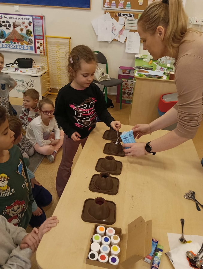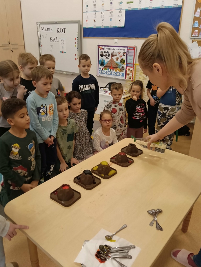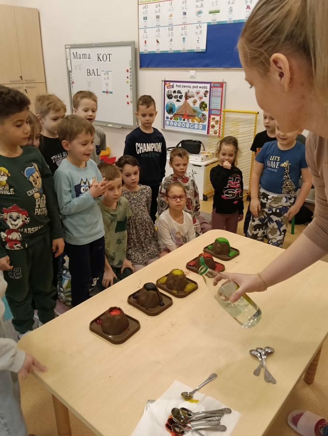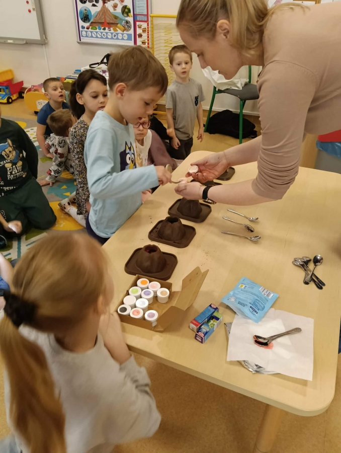 Na początku wykonaliśmy eksperyment przedstawiający wybuch wulkanu. Do przygotowanego wulkanu wlaliśmy wodę z barwnikiem spożywczym, a następnie wsypaliśmy sodę oczyszczoną. W kolejnym kroku dodaliśmy ocet. Po chwili mogliśmy obserwować efektowną „erupcję” – kolorowa piana zaczęła wypływać z wulkanu niczym lawa!