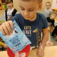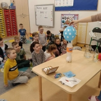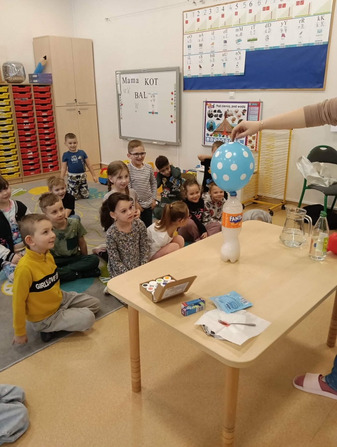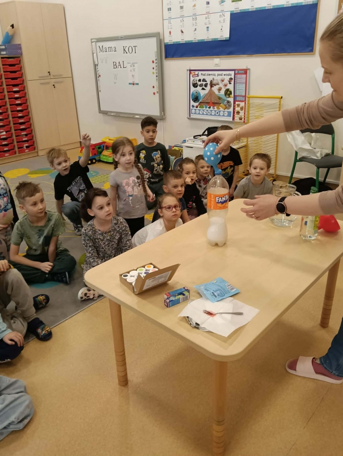 Dzieci z zaciekawieniem obserwowały, jak balon rośnie. Wyjaśniliśmy, że tak jak w poprzednim eksperymencie, powstał gaz – dwutlenek węgla – który wypełnił balon. To była świetna okazja do rozmowy o tym, że gaz, choć niewidoczny, zajmuje miejsce.