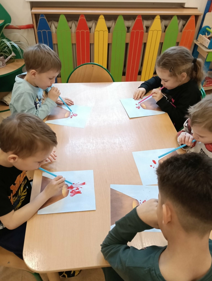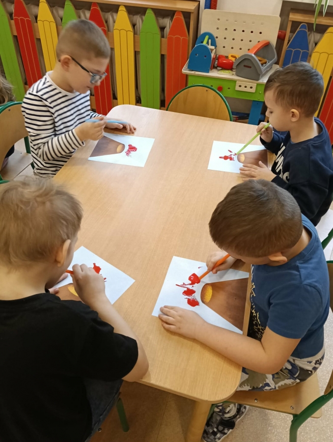 Na zakończenie zajęć przedszkolaki wykonały pracę plastyczną. Ich zadaniem było stworzenie obrazu przedstawiającego wybuchający wulkan. Za pomocą słomek rozdmuchiwały farbę na kartce, tak aby wyglądało, że z wulkanu wypływa lawa.