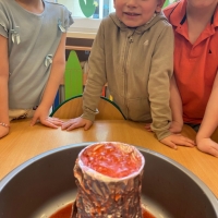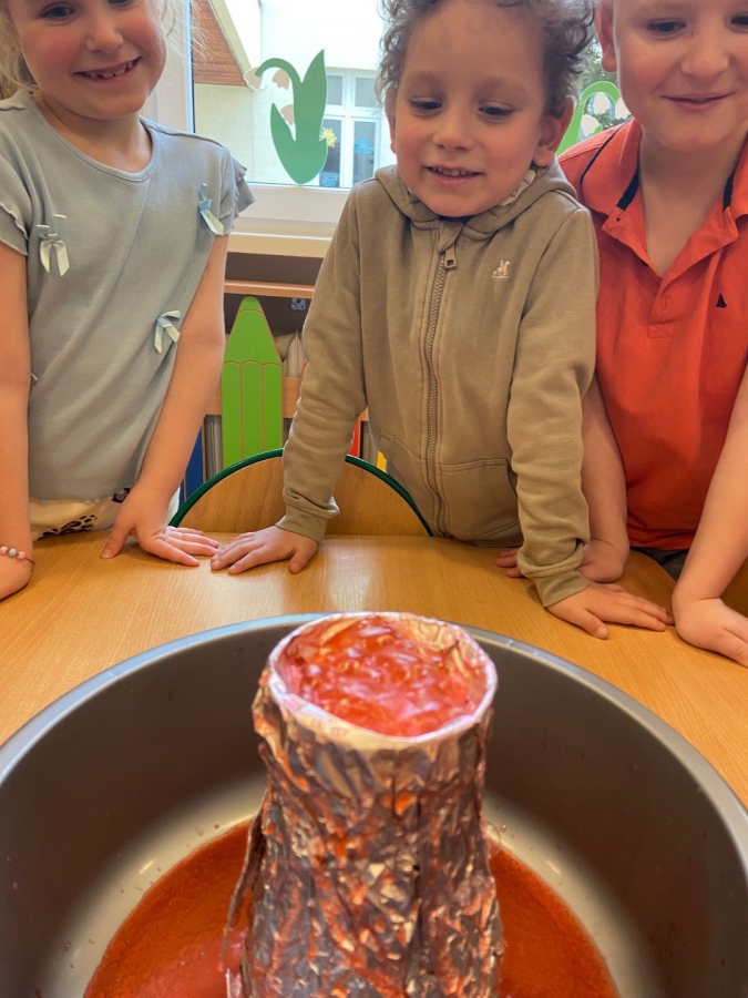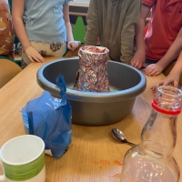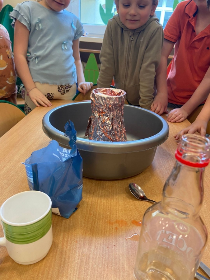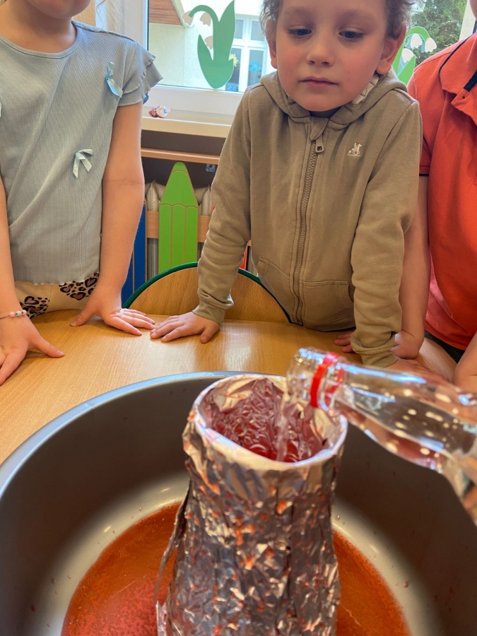 Na początku wykonaliśmy eksperyment przedstawiający wybuch wulkanu. Do przygotowanego wulkanu wlaliśmy wodę z barwnikiem spożywczym, a następnie wsypaliśmy sodę oczyszczoną. W kolejnym kroku dodaliśmy ocet. Po chwili mogliśmy obserwować efektowną „erupcję” – kolorowa piana zaczęła wypływać z wulkanu niczym lawa!