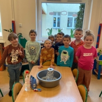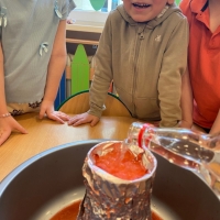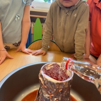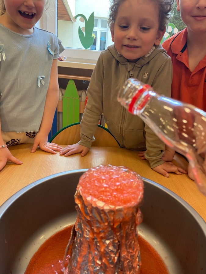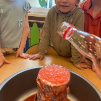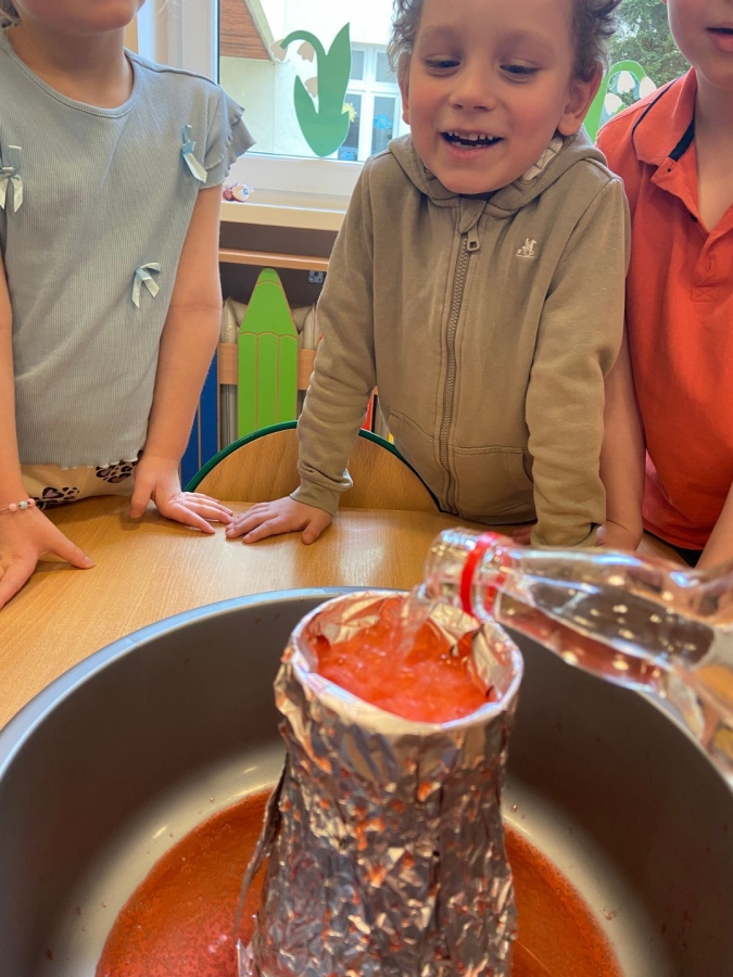 Dzieci dowiedziały się, że połączenie octu i sody powoduje reakcję chemiczną, w wyniku której powstaje gaz (dwutlenek węgla). To właśnie ten gaz sprawił, że nasz wulkan „wybuchł”. Eksperyment wzbudził ogromne zainteresowanie i wiele pozytywnych emocji.