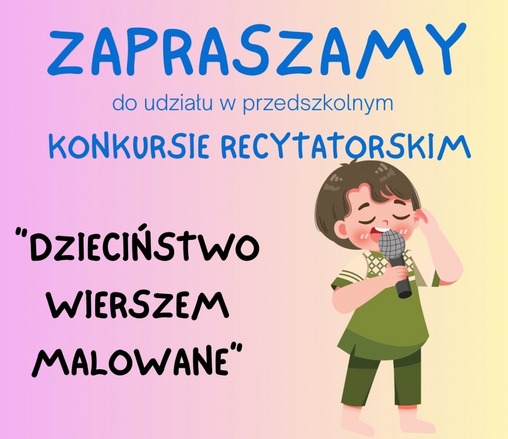 Serdecznie zapraszamy naszych przedszkolaków do wzięcia udziału w Konkursie Recytatorskim "Dzieciństwo wierszem malowane", organizowanym przez Przedszkole nr 3.