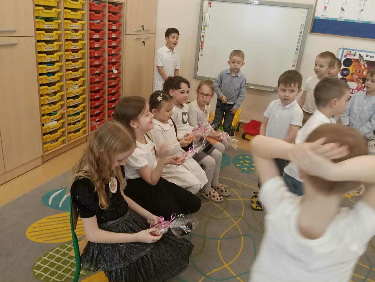 W poniedziałek w naszym przedszkolu obchodziliśmy Dzień Kobiet w bardzo radosnej i uroczystej atmosferze. Wszystkie dzieci wspólnie zaprezentowały wiersz przygotowany specjalnie na tę okazję. Przedszkolaki recytowały go głośno i z uśmiechem, starając się jak najlepiej wypaść przed koleżankami i paniami. Po recytacji dzieci zatańczyły przygotowany wcześniej taniec. Rytmiczna muzyka sprawiła, że na twarzach wszystkich pojawiły się uśmiechy.