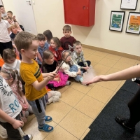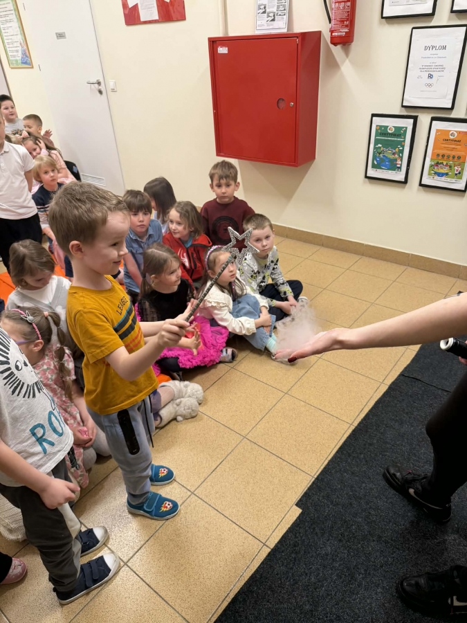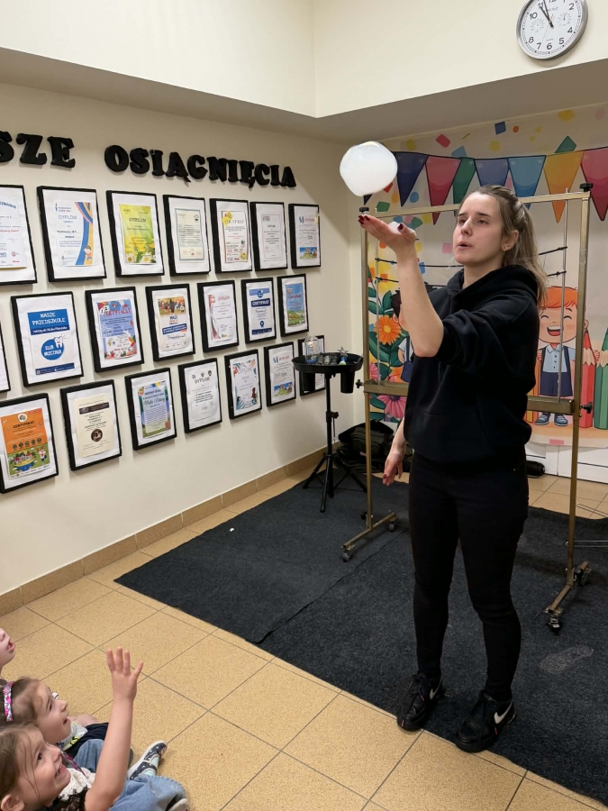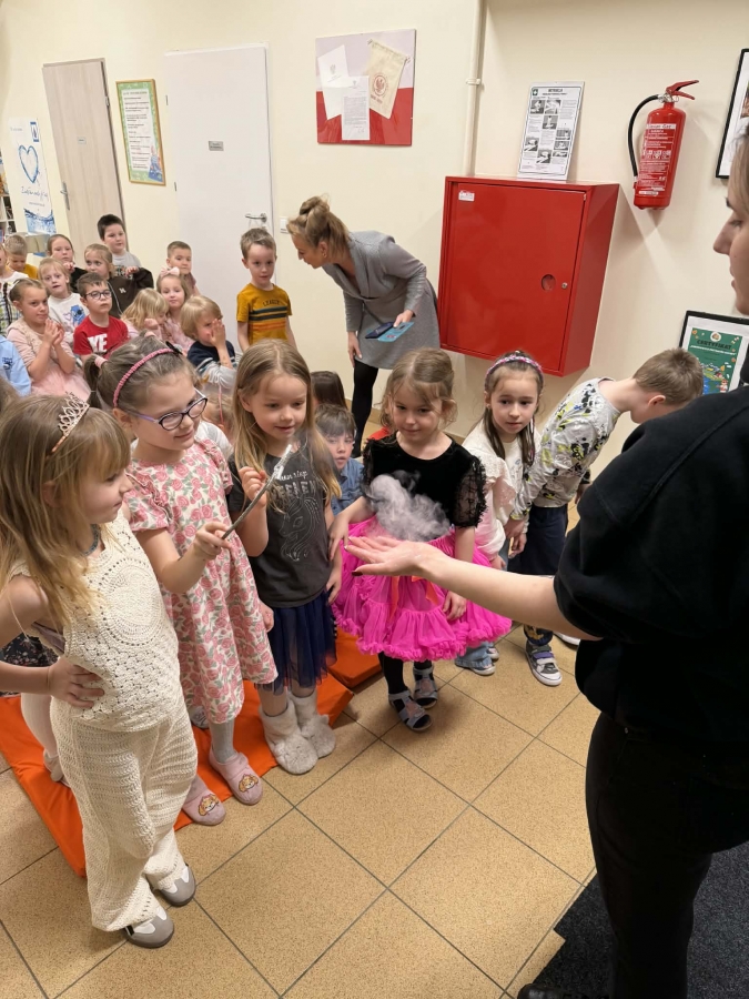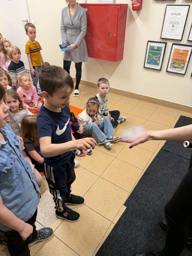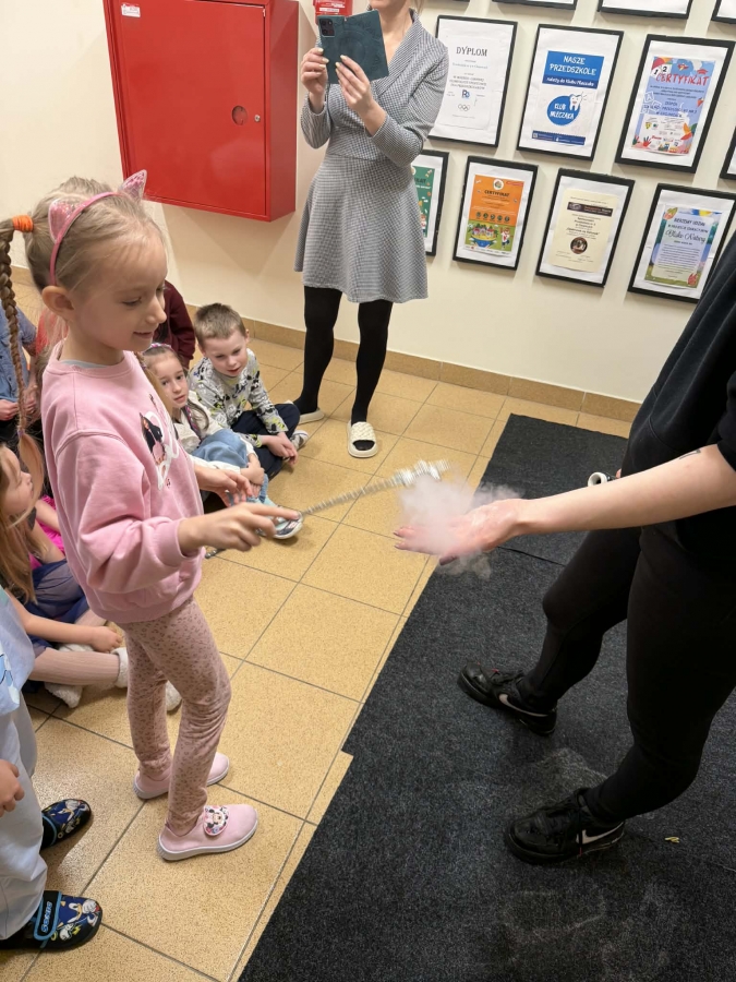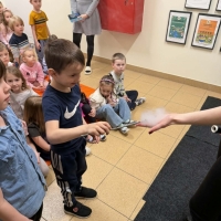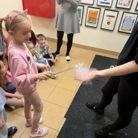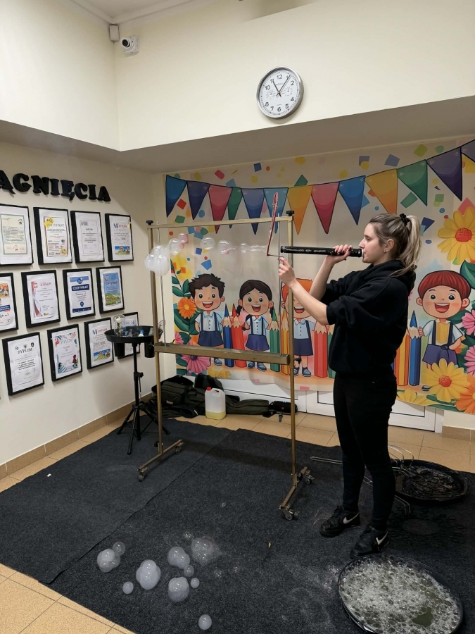 Przedszkolaki miały okazję podziwiać nie tylko klasyczne, kolorowe bańki unoszące się w powietrzu, ale także te wypełnione dymem, które wyglądały wyjątkowo magicznie.
