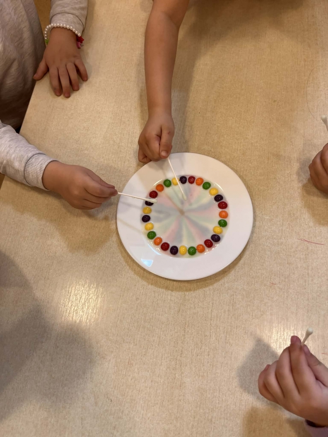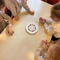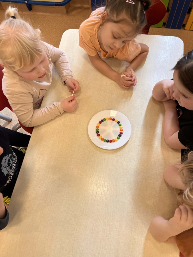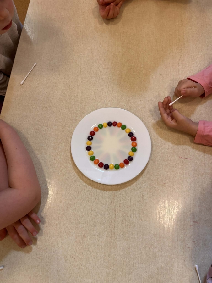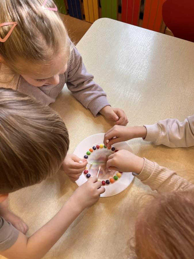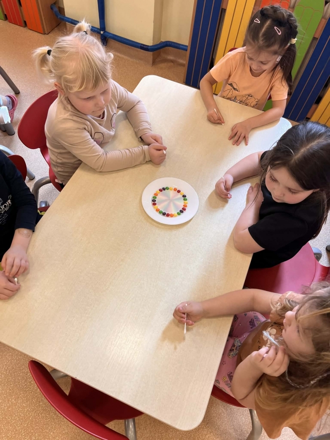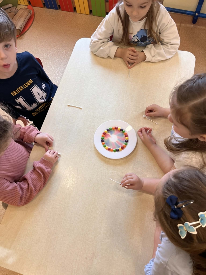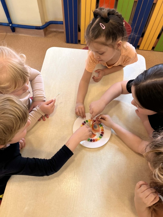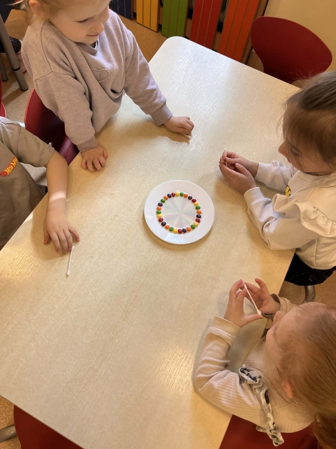 Tęcza- eksperyment 19 marca 2026 | Opublikowane w: Biedronki 2025/2026 „Magiczna tęcza na talerzu! Dzieci odkrywały, jak zwykłe cukierki mogą zamienić się w niezwykły, kolorowy eksperyment.”