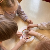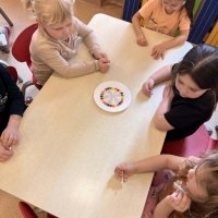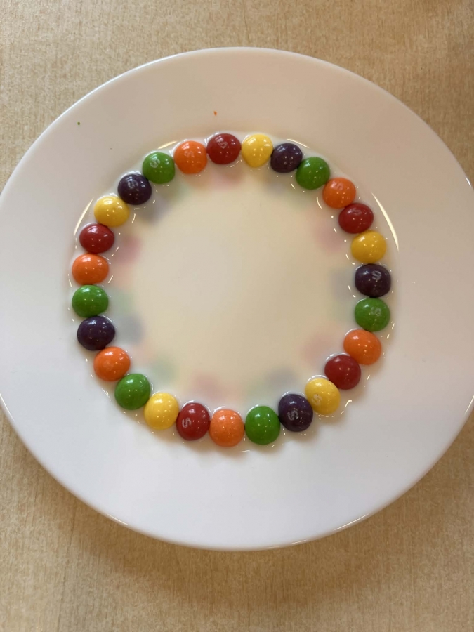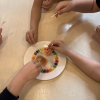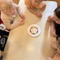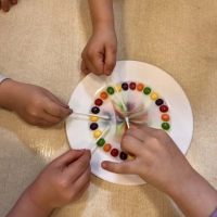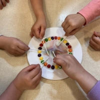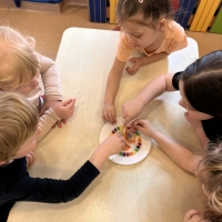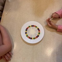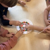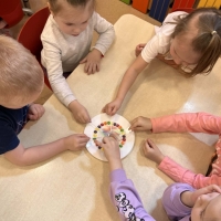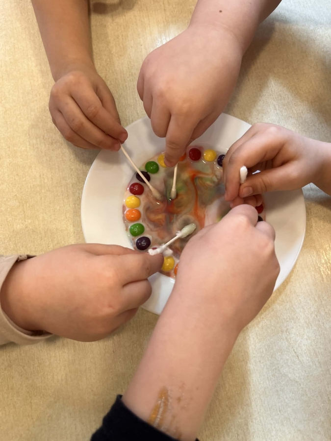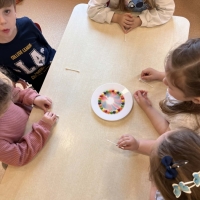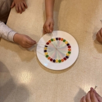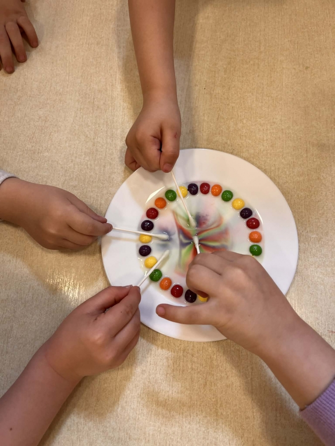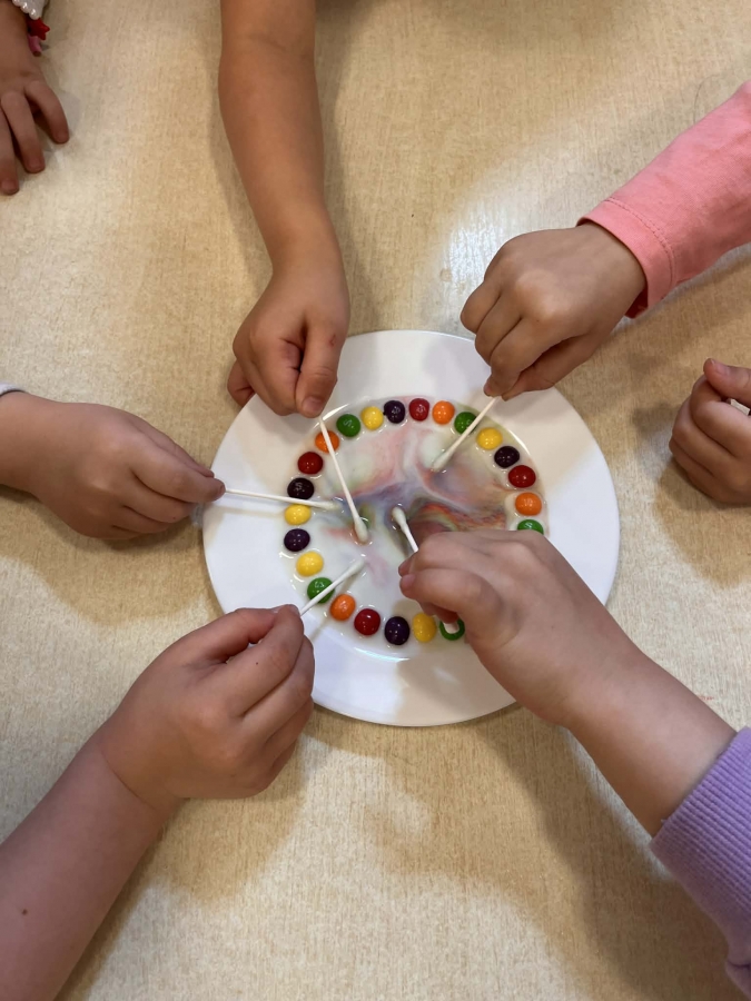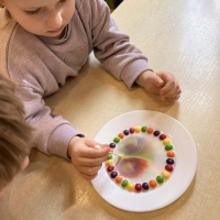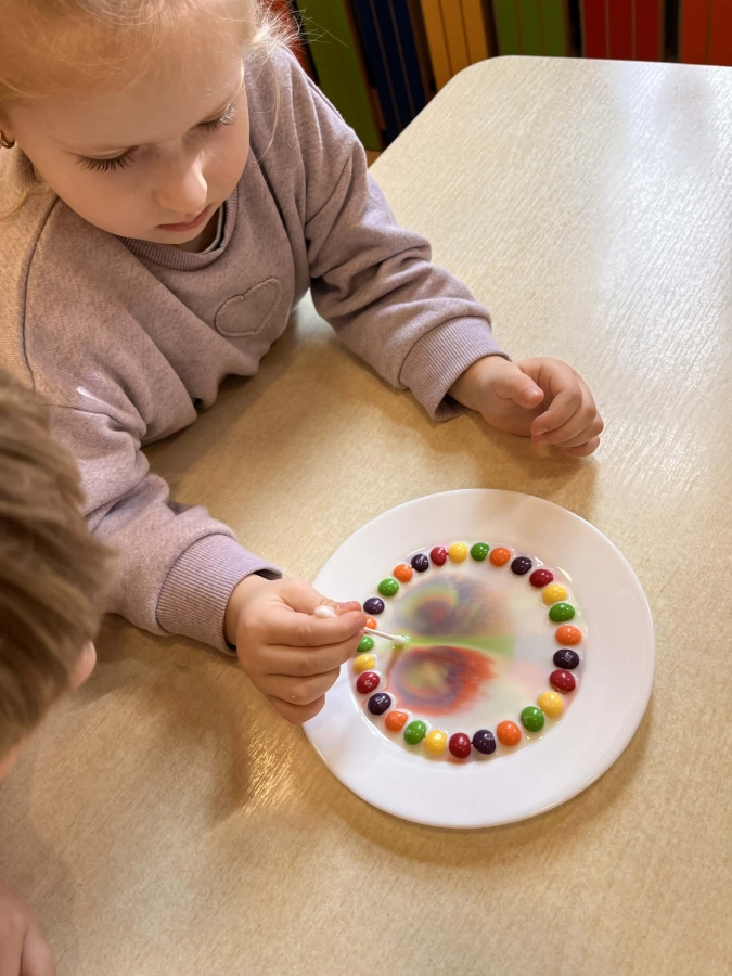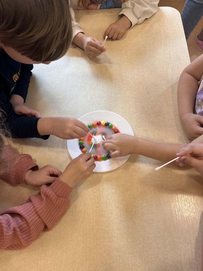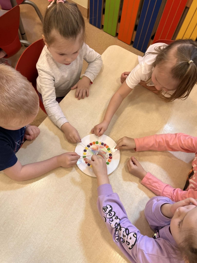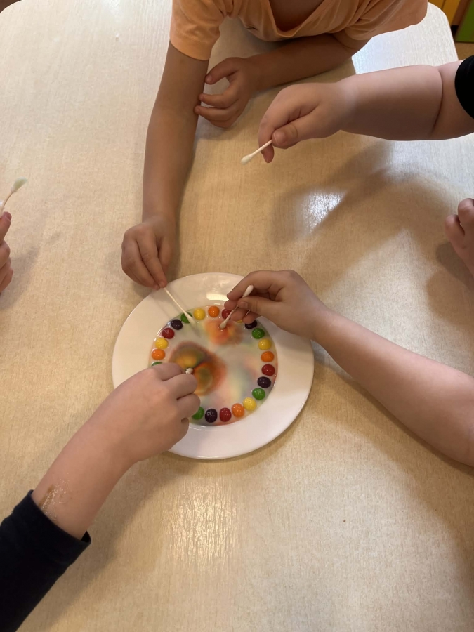 Tęcza- eksperyment 19 marca 2026 | Opublikowane w: Biedronki 2025/2026 „Magiczna tęcza na talerzu! Dzieci odkrywały, jak zwykłe cukierki mogą zamienić się w niezwykły, kolorowy eksperyment.”