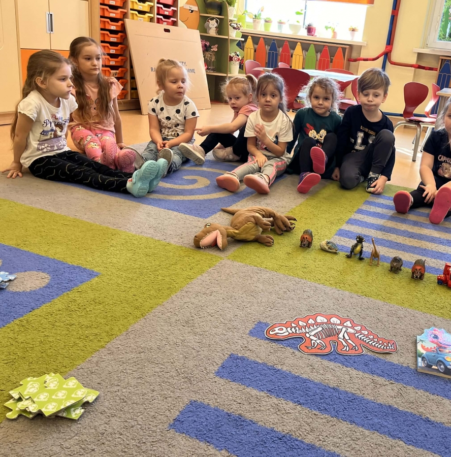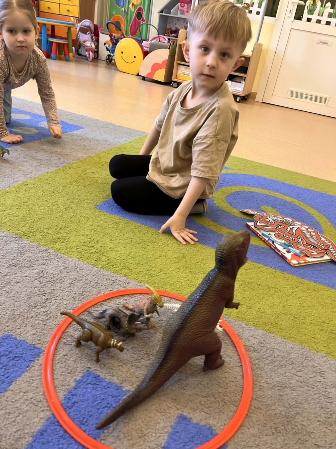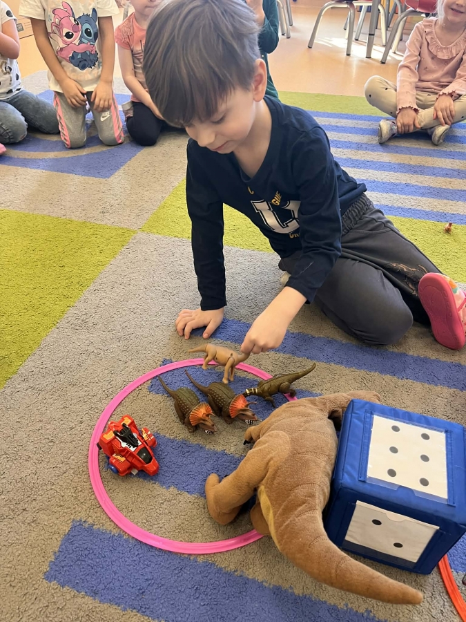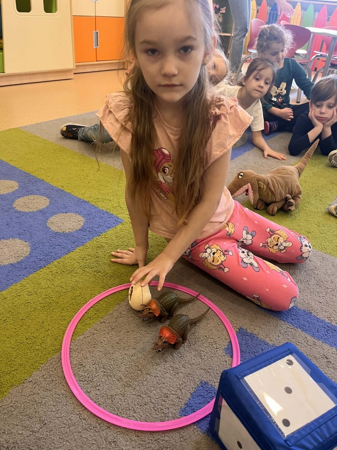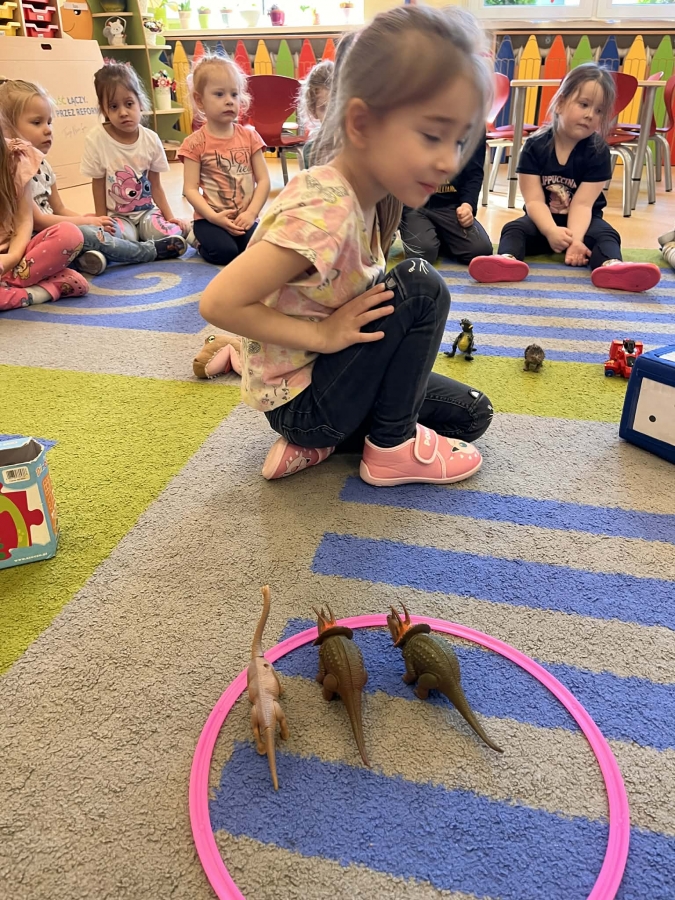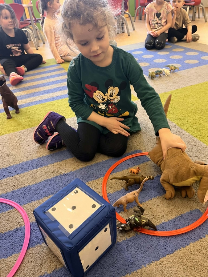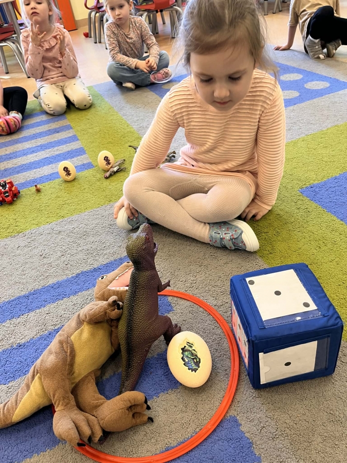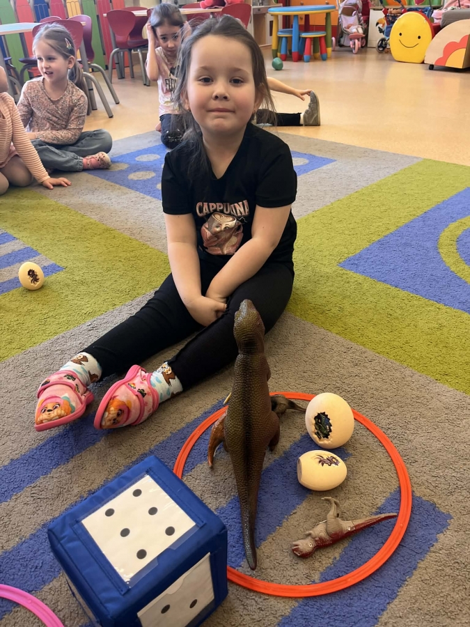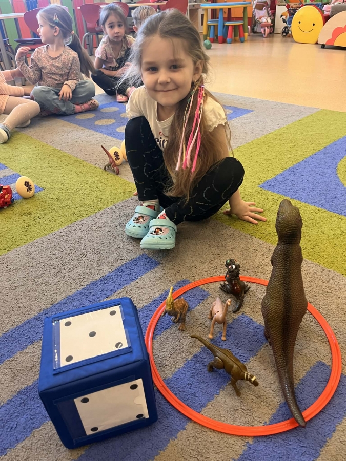 Podczas zajęć nie zabrakło również zabaw matematycznych – przeliczaliśmy dinozaury, rzucaliśmy kostką i układaliśmy w hula hop tyle dinozaurów, ile wskazała liczba. Nauka przez zabawę sprawiła wszystkim wiele radości!