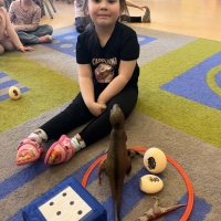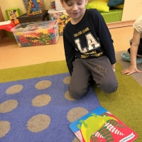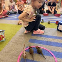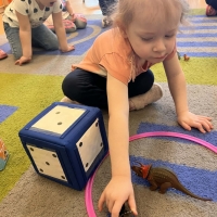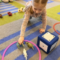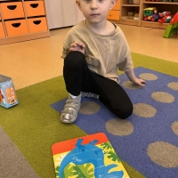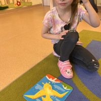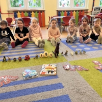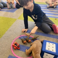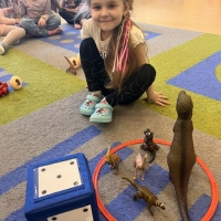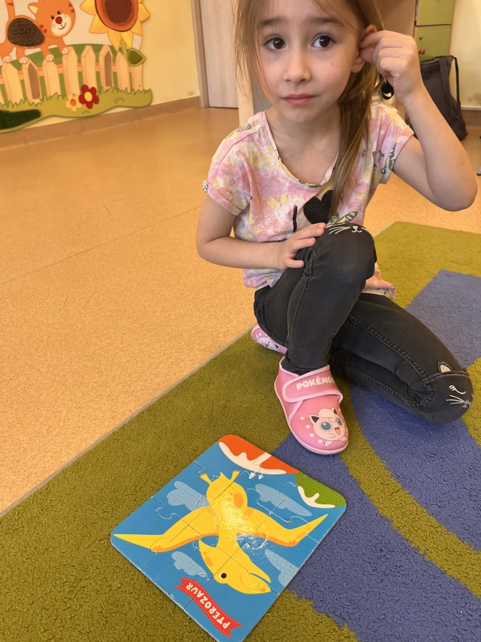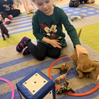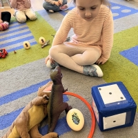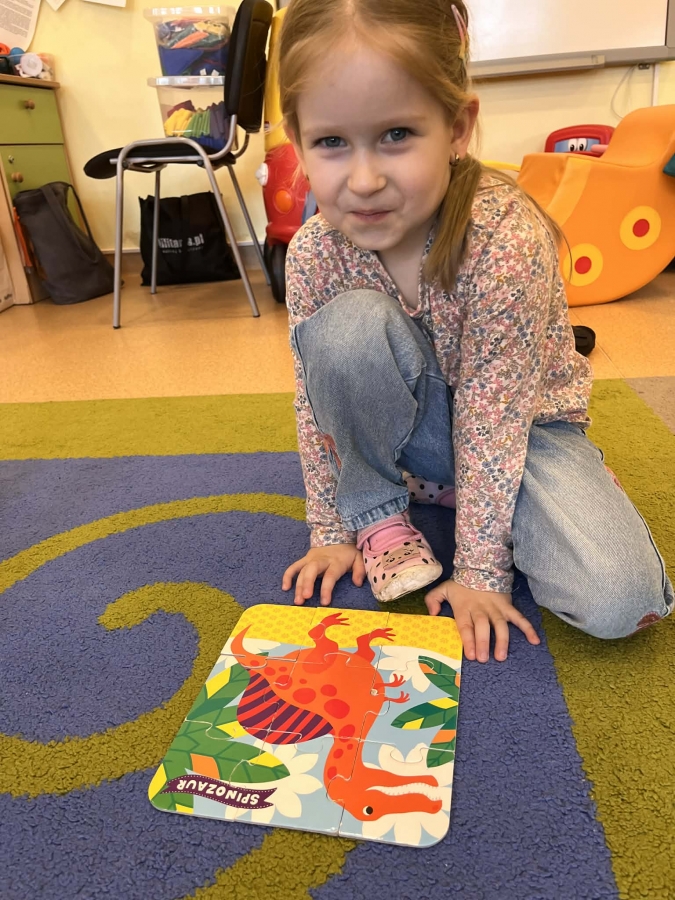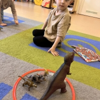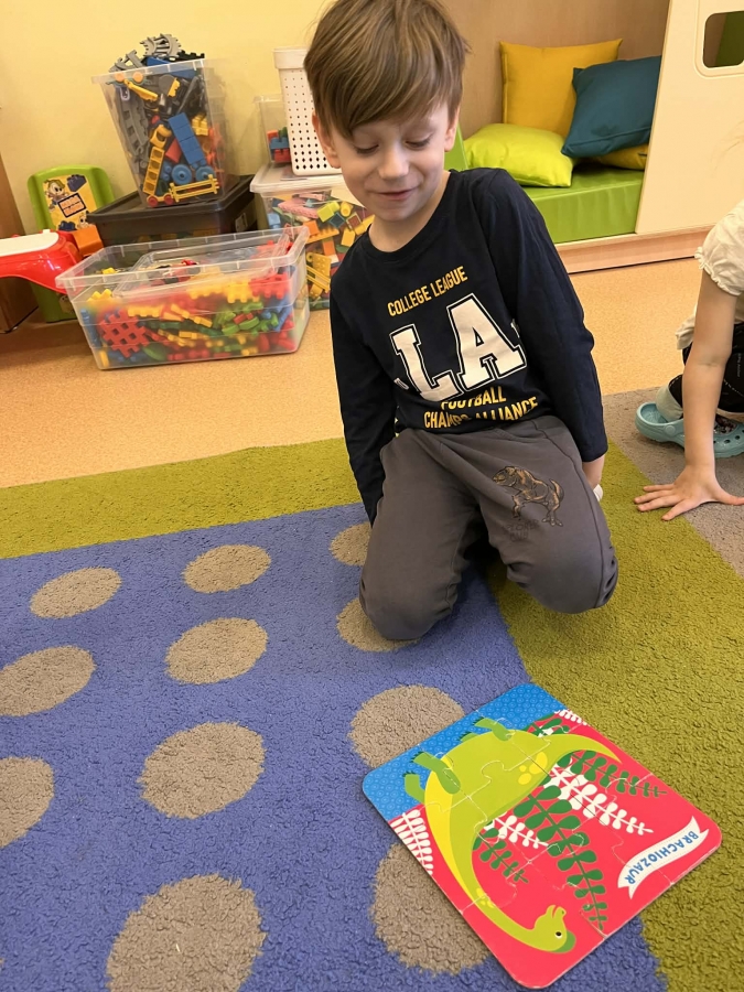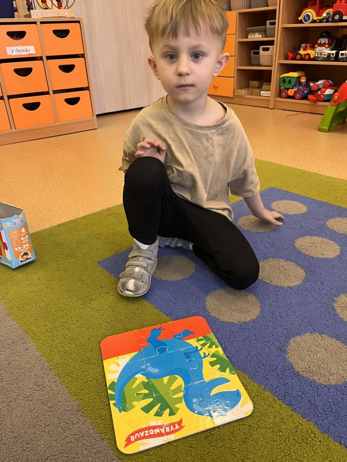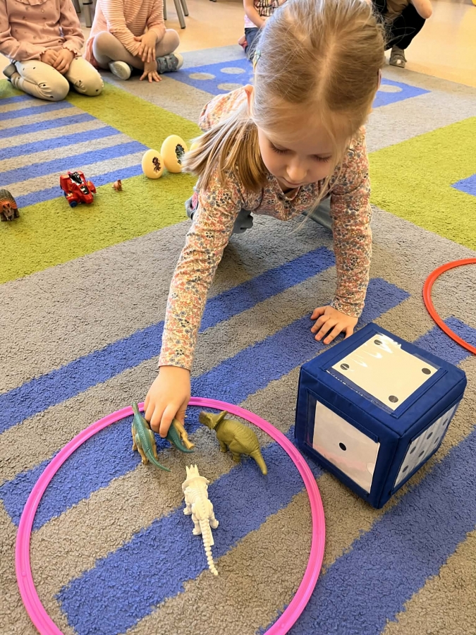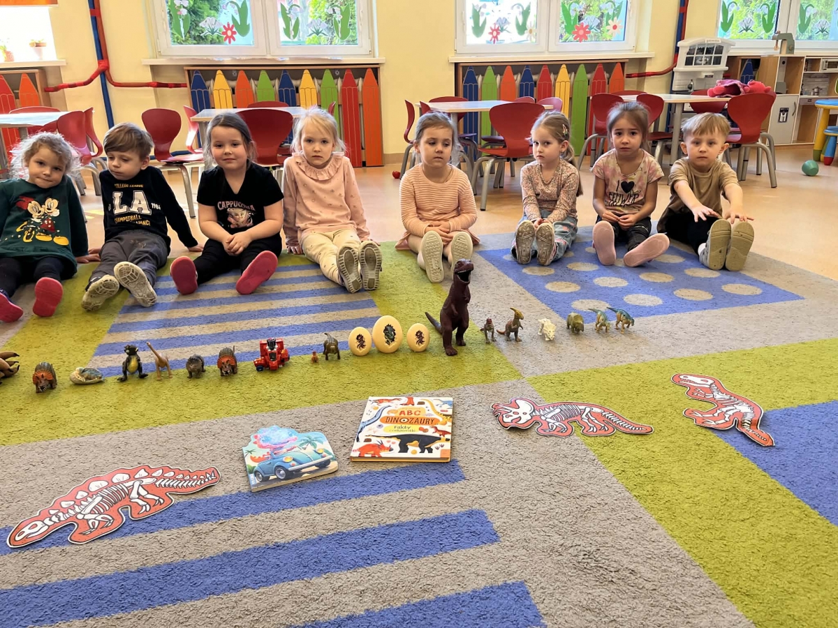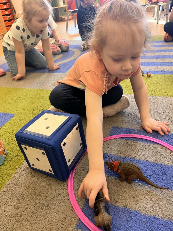 Podczas zajęć nie zabrakło również zabaw matematycznych – przeliczaliśmy dinozaury, rzucaliśmy kostką i układaliśmy w hula hop tyle dinozaurów, ile wskazała liczba. Nauka przez zabawę sprawiła wszystkim wiele radości!