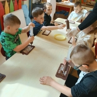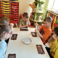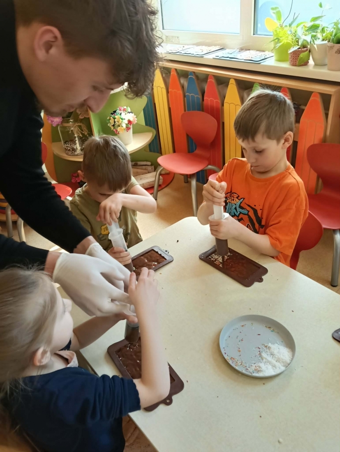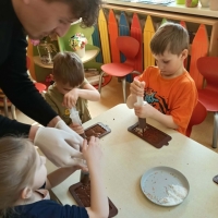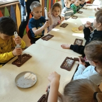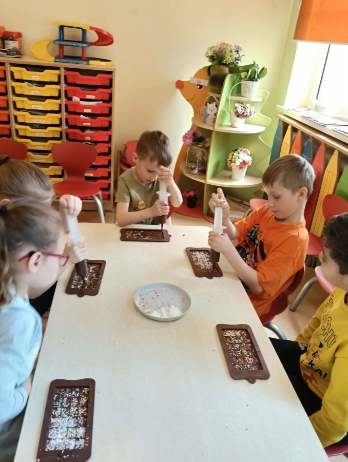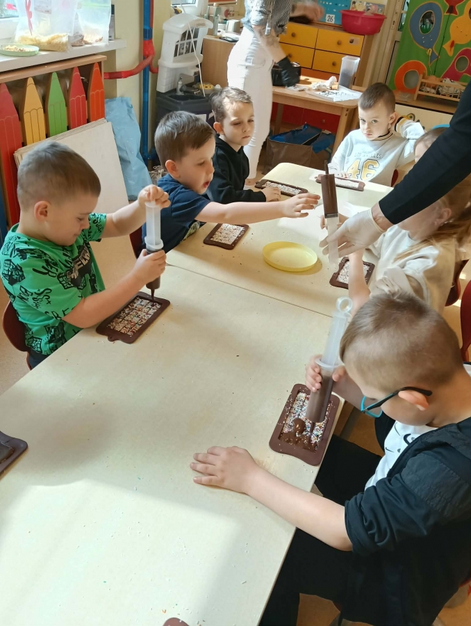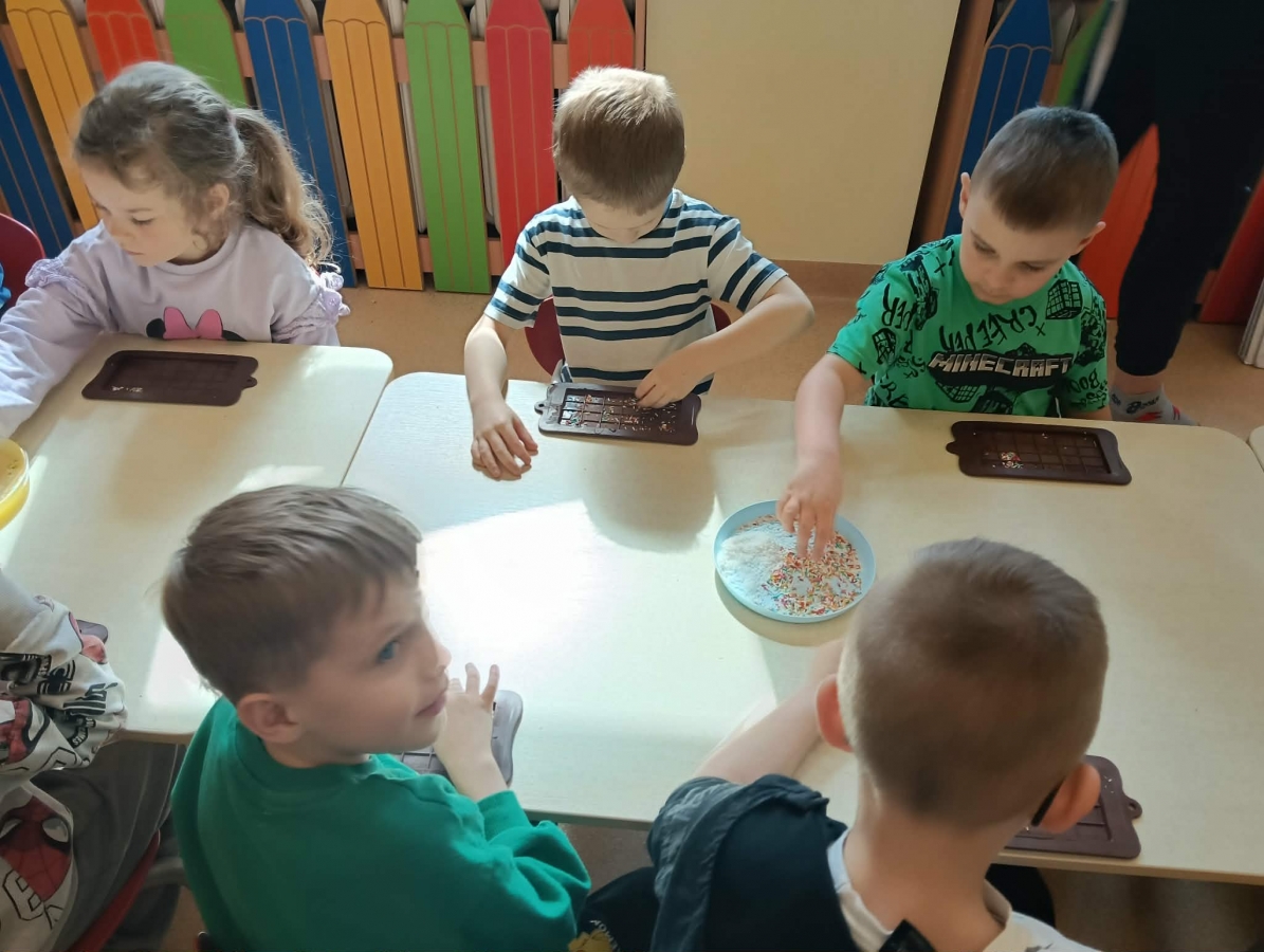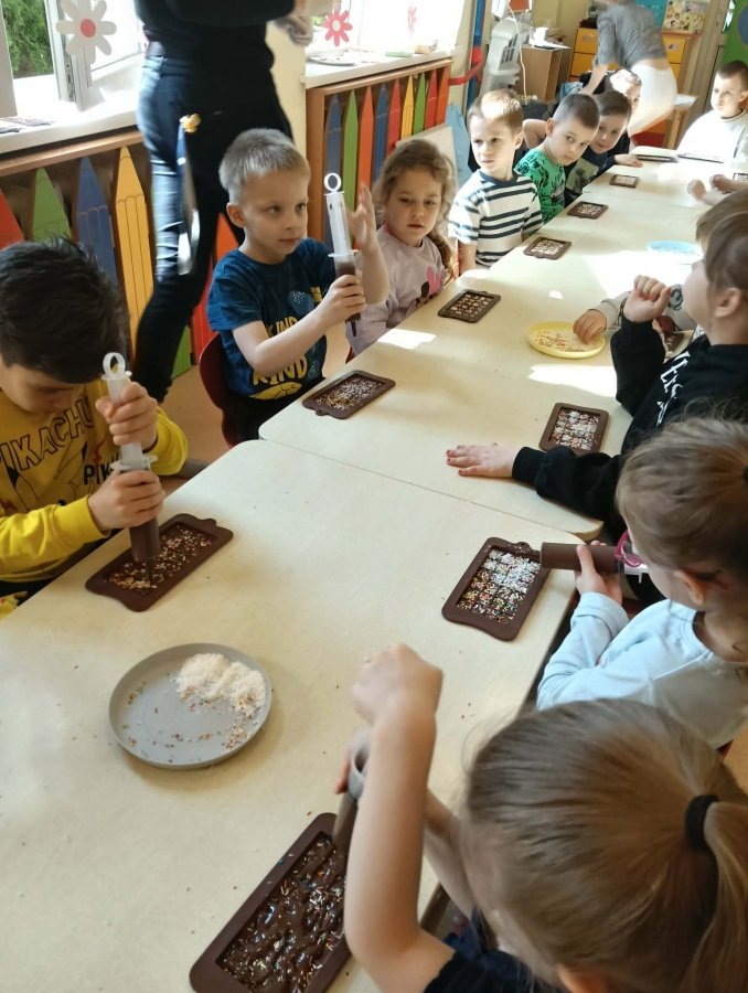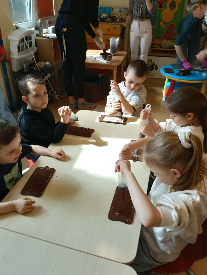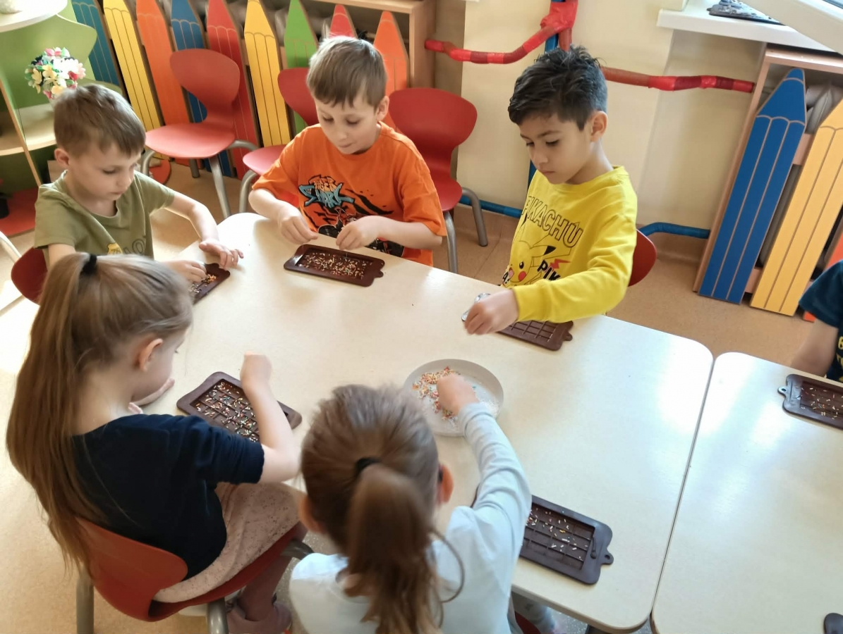 Dzieci dowiedziały się, gdzie rośnie kakao oraz jak wygląda proces powstawania czekolady – od ziaren aż po gotową tabliczkę. Największą atrakcją były warsztaty, podczas których każdy mógł samodzielnie przygotować własną tabliczkę czekolady, ozdabiając ją według własnego pomysłu.