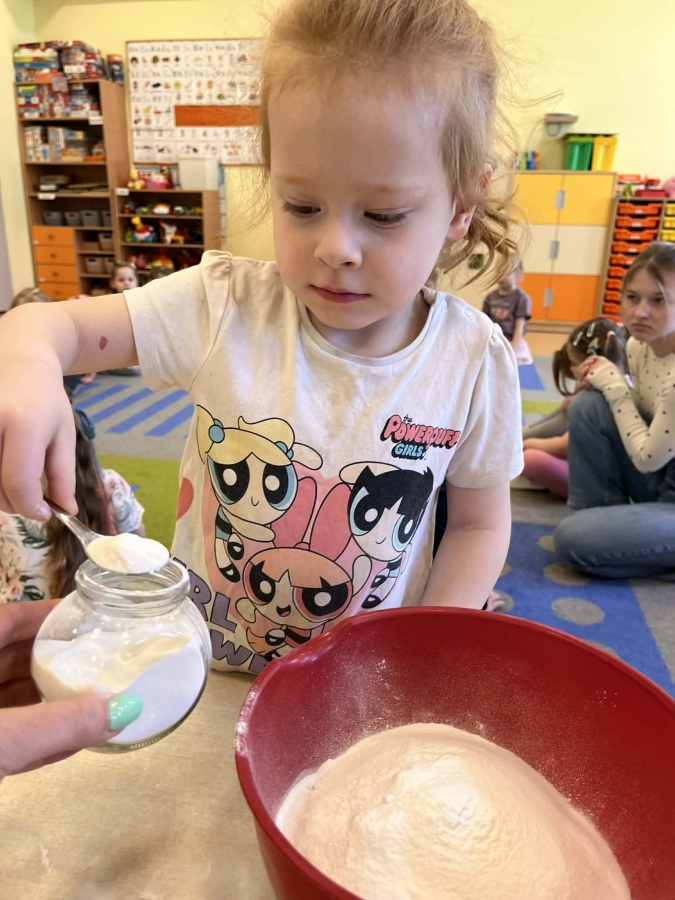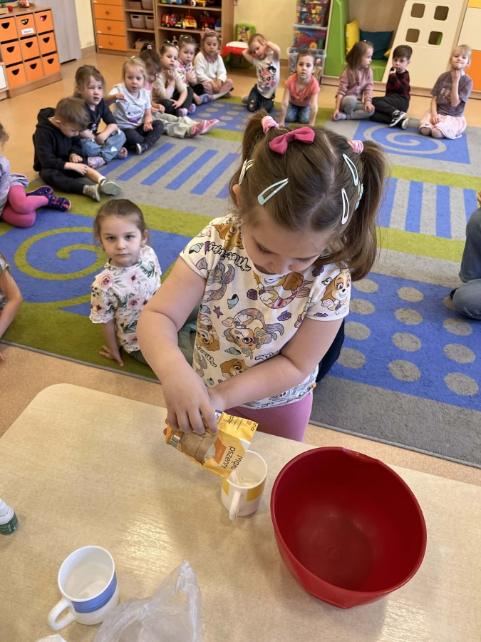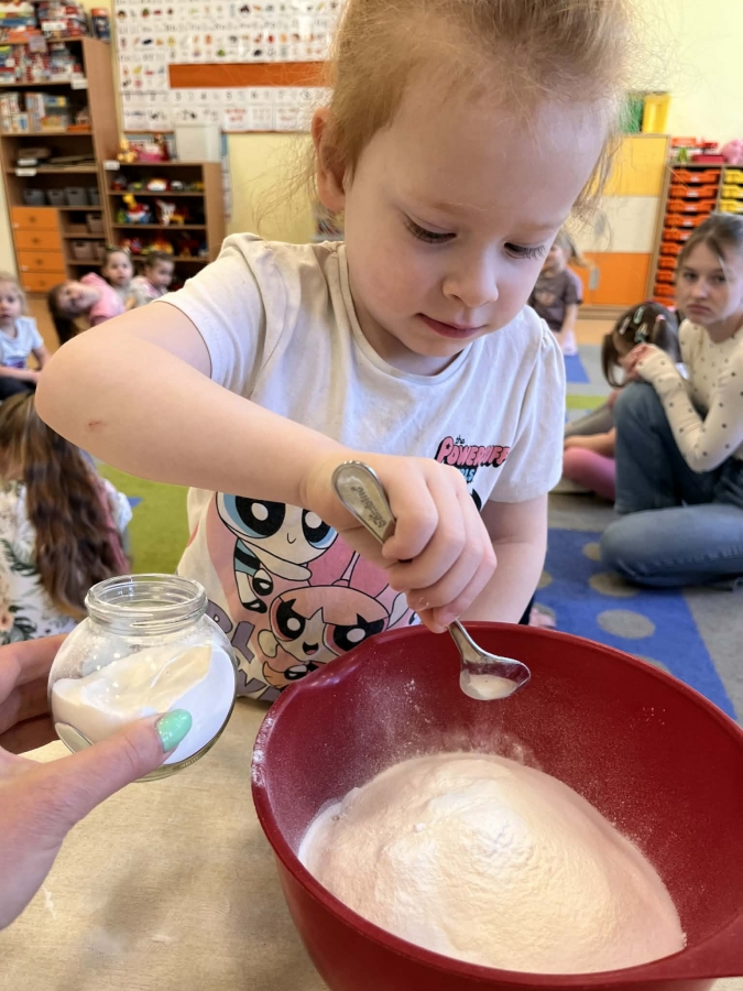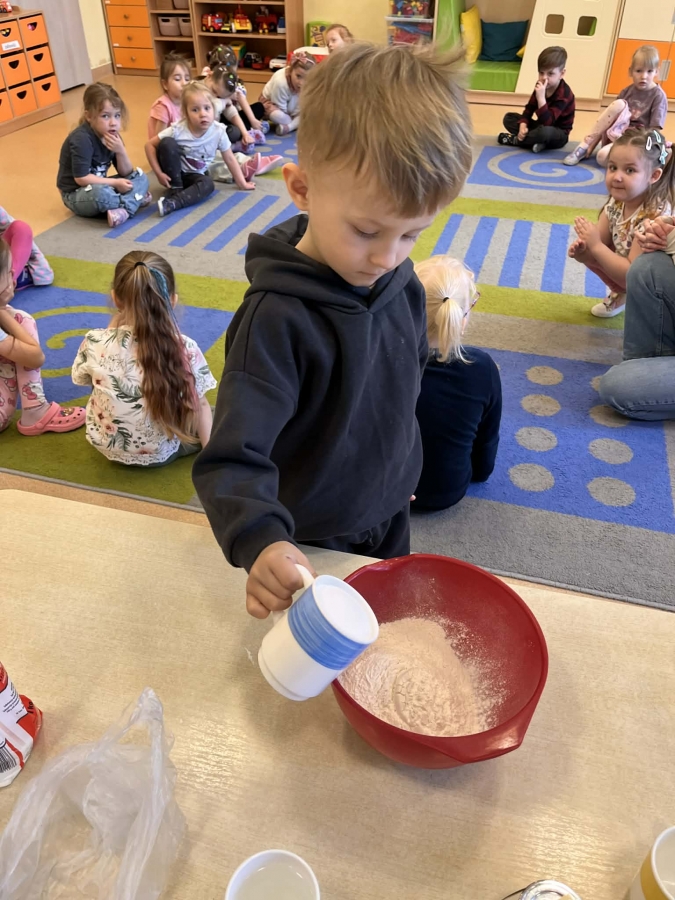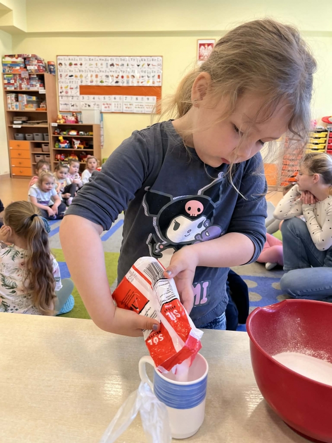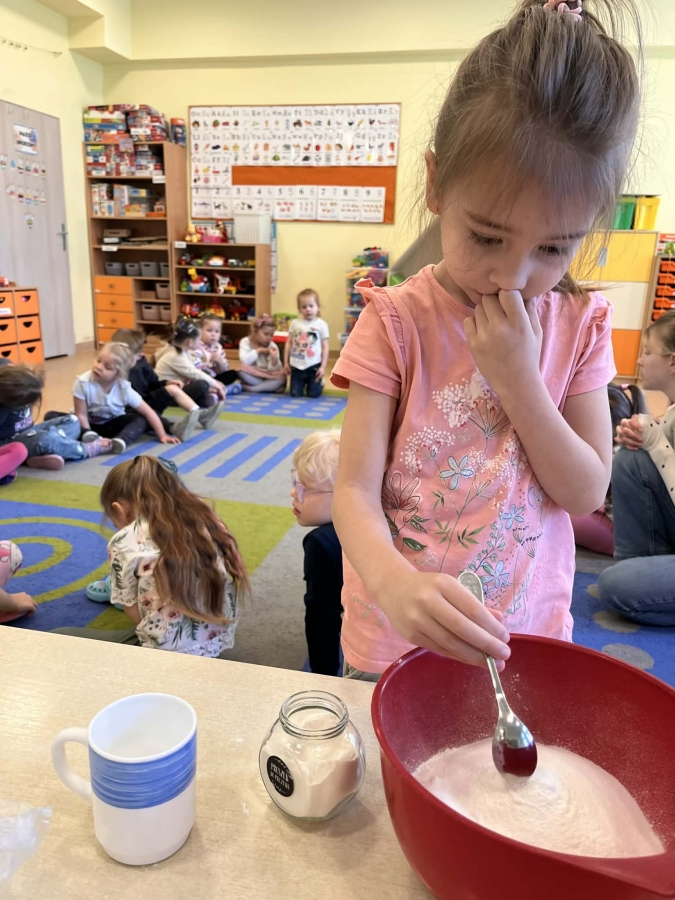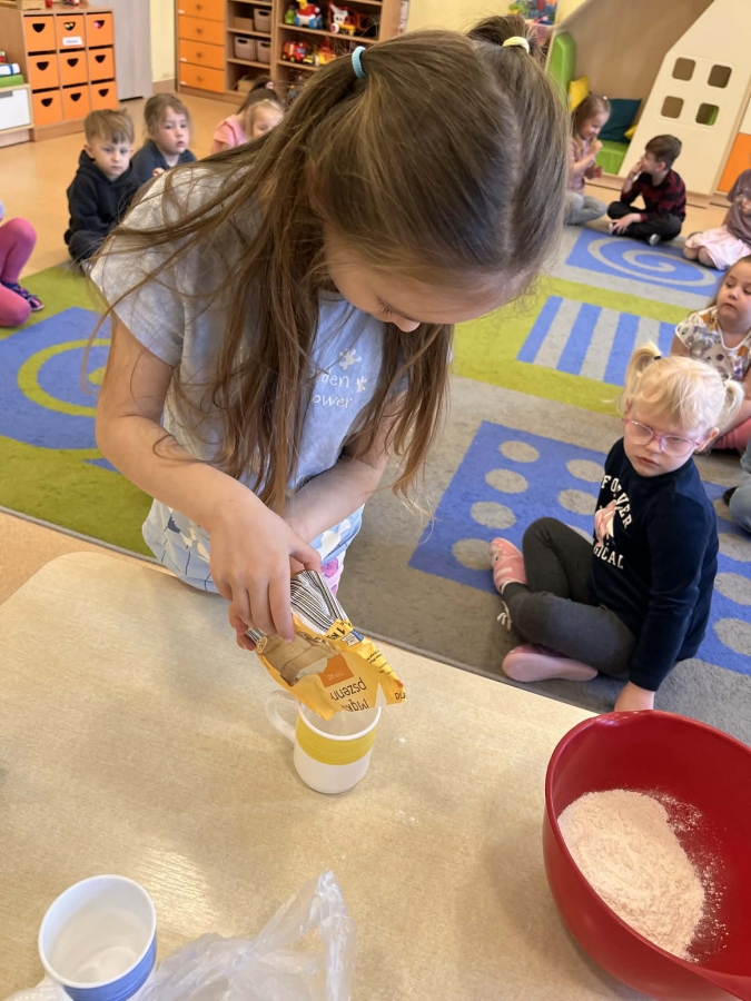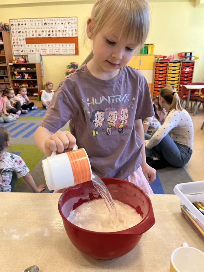 Podczas zajęć nie zabrakło również eksperymentów – wspólnie stworzyliśmy „rosnącą farbę”, co było dla dzieci nie tylko świetną zabawą, ale także okazją do nauki poprzez działanie. Każde dziecko miało swoje zadanie, dzięki czemu wszyscy aktywnie uczestniczyli w zajęciach i mogli poczuć się częścią zespołu.