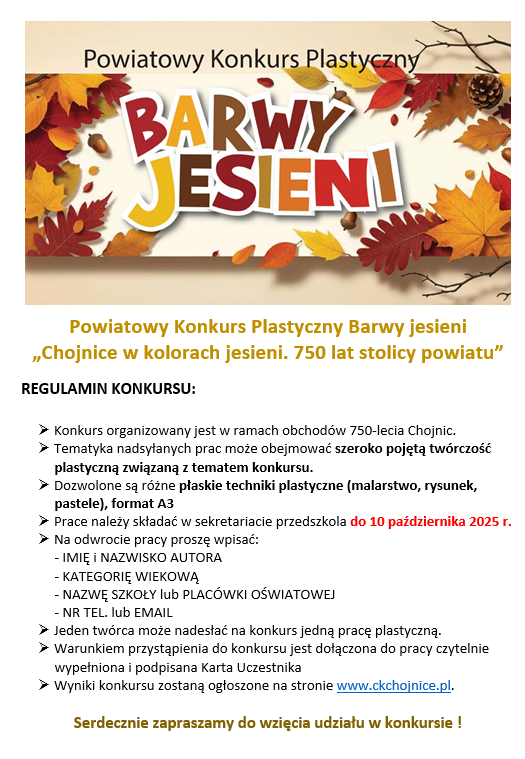 | 3 | Powiatowy Konkurs Plastyczny Barwy Jesieni "Chojnice w kolorach jesieni. 750 lat stolicy powiatu" | wrzesień/październik 2025 |